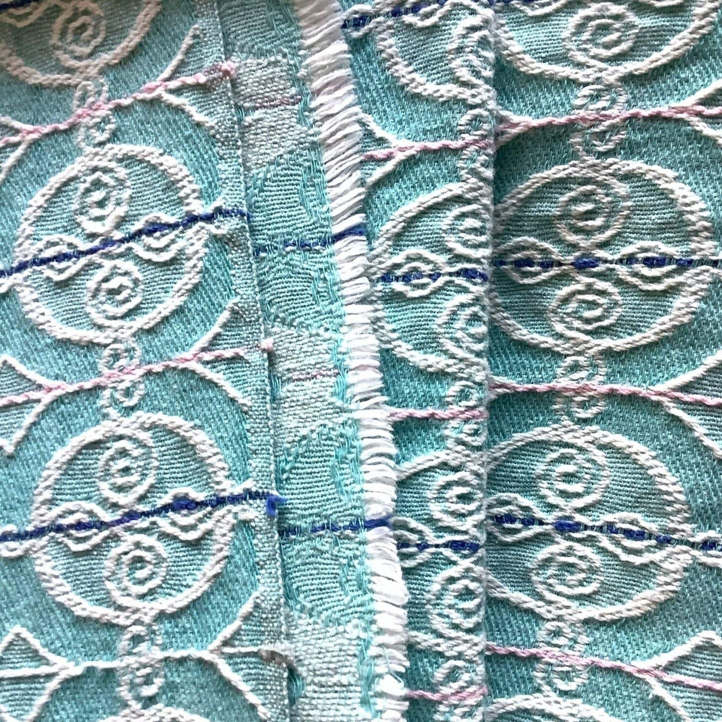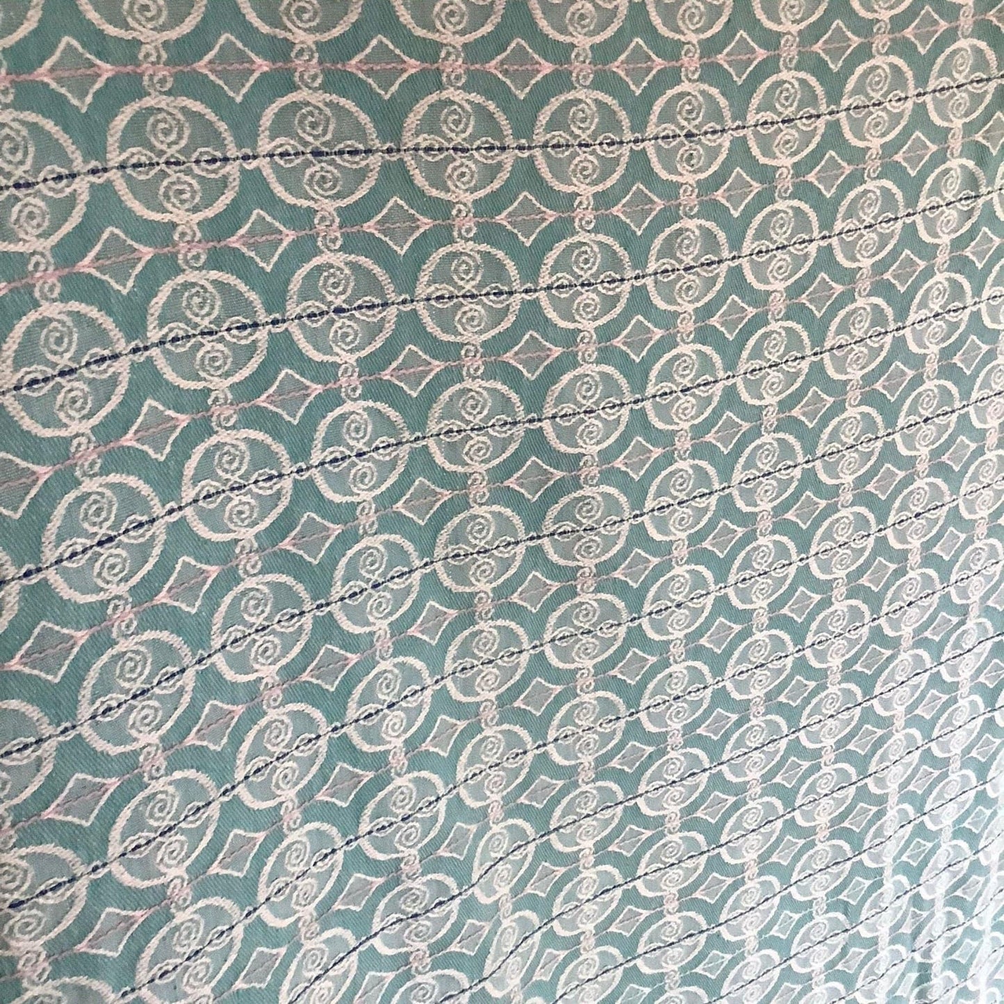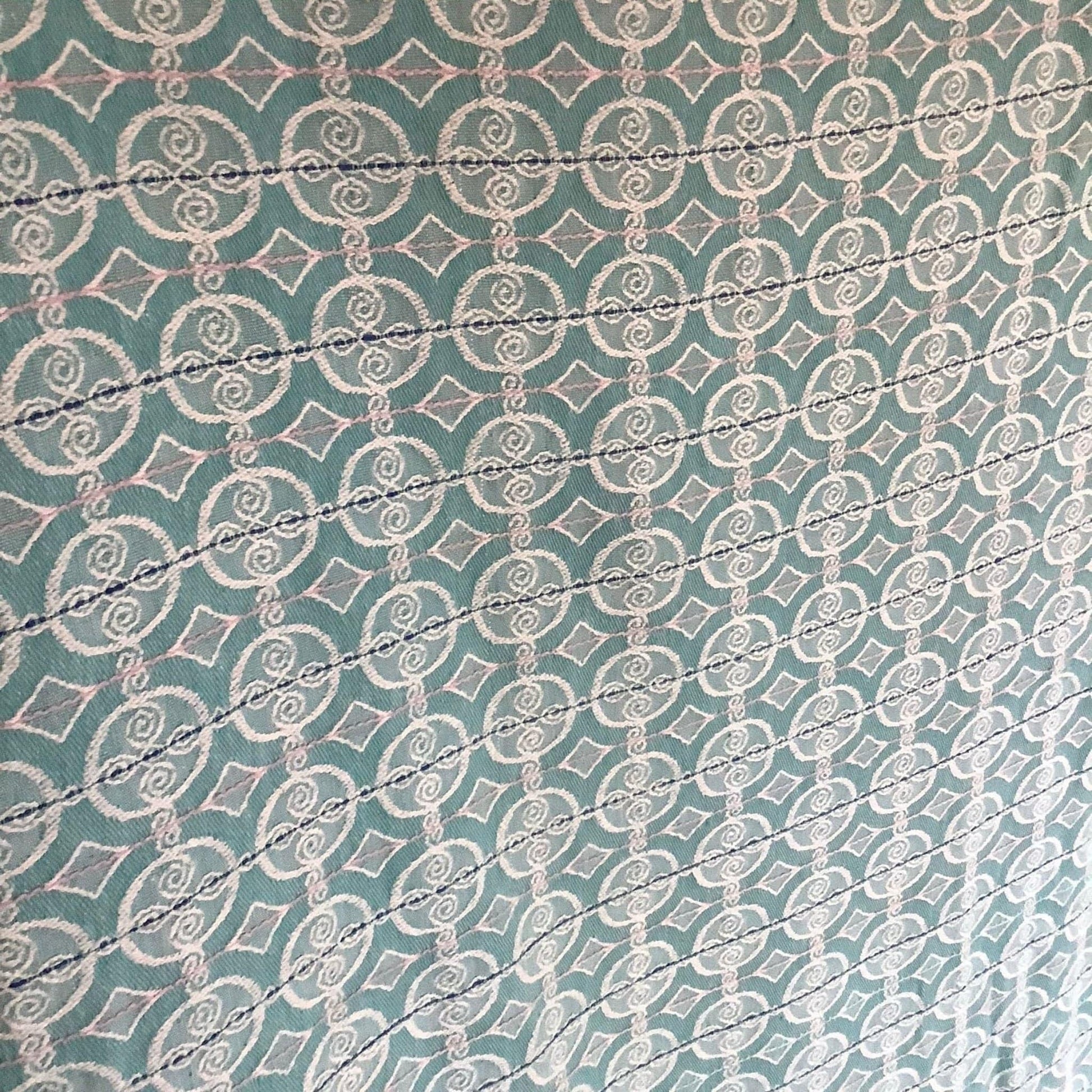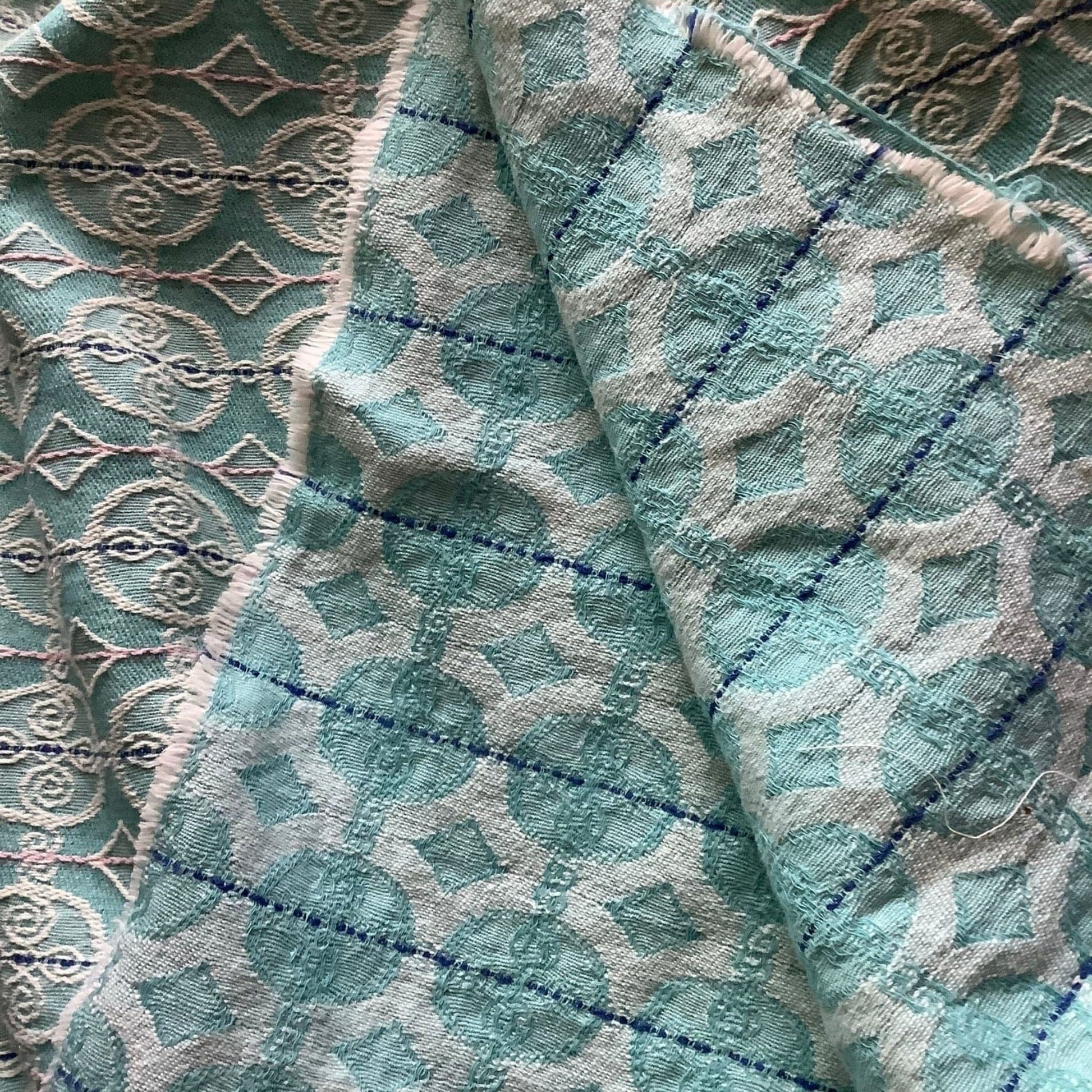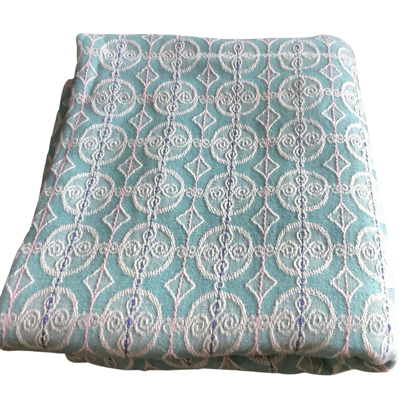 Art Deco Bedspread exemplifies authentic 1940s textile design with its distinctive geometric pattern and sophisticated color palette. This collectible vintage bedspread features striking teal-blue, pink, white, and navy blue combinations that capture the essence of the Art Deco era. The soft cotton construction and heirloom quality craftsmanship make this twin-size bedspread both a functional textile and a timeless decorative piece that adds nostalgic charm to any bedroom setting.