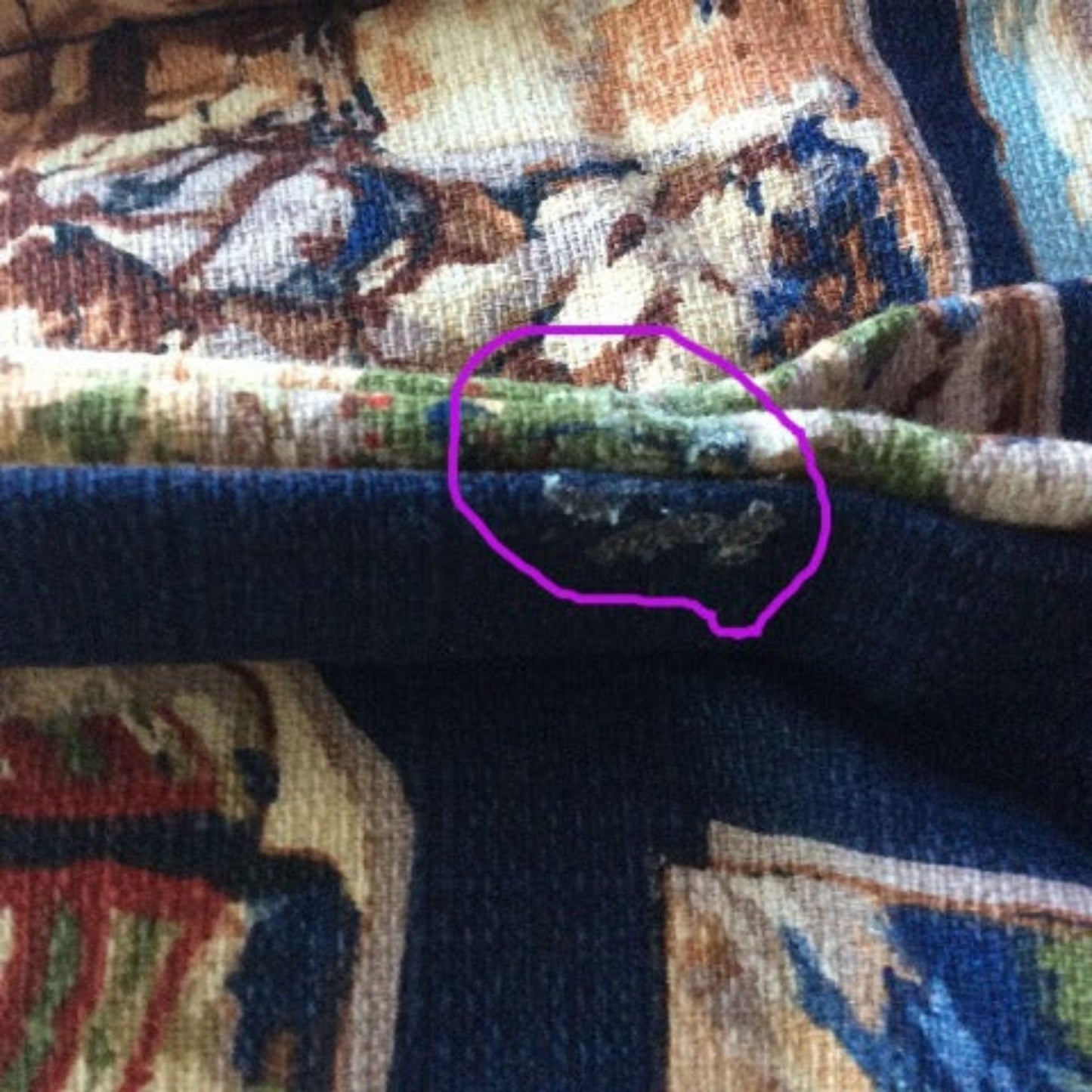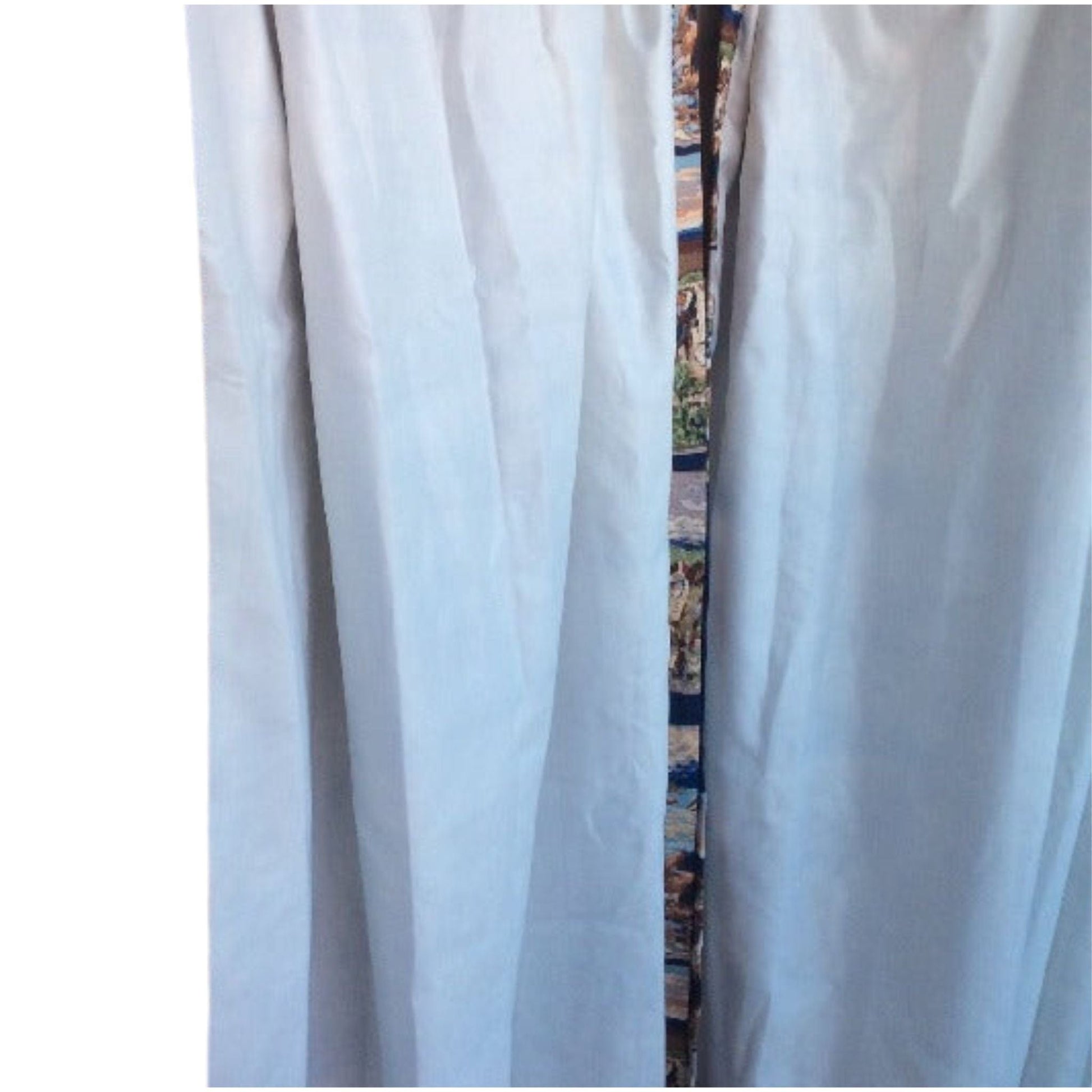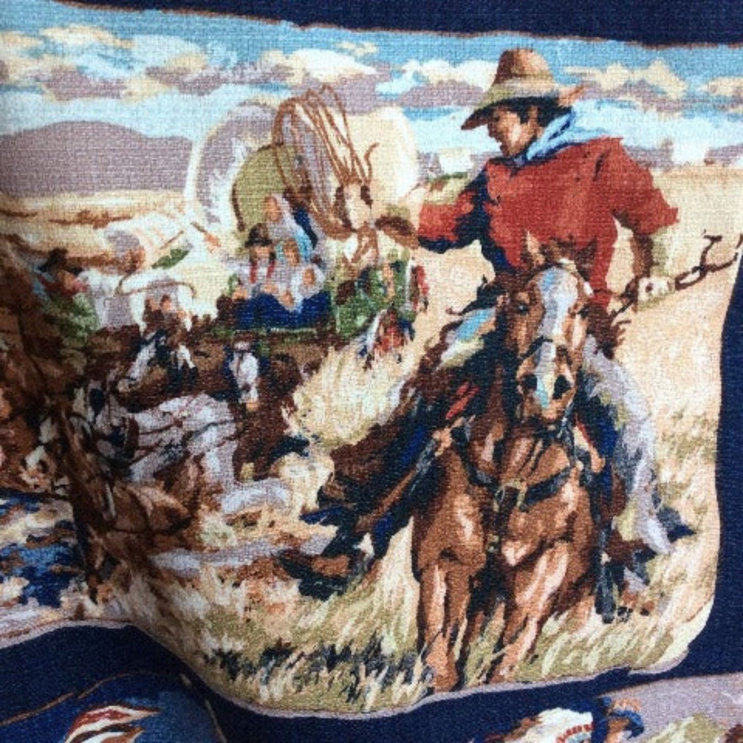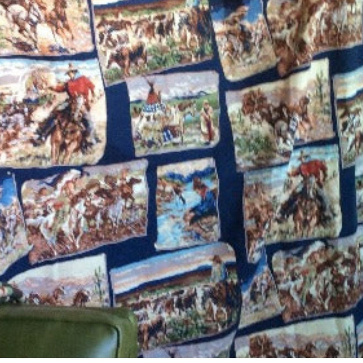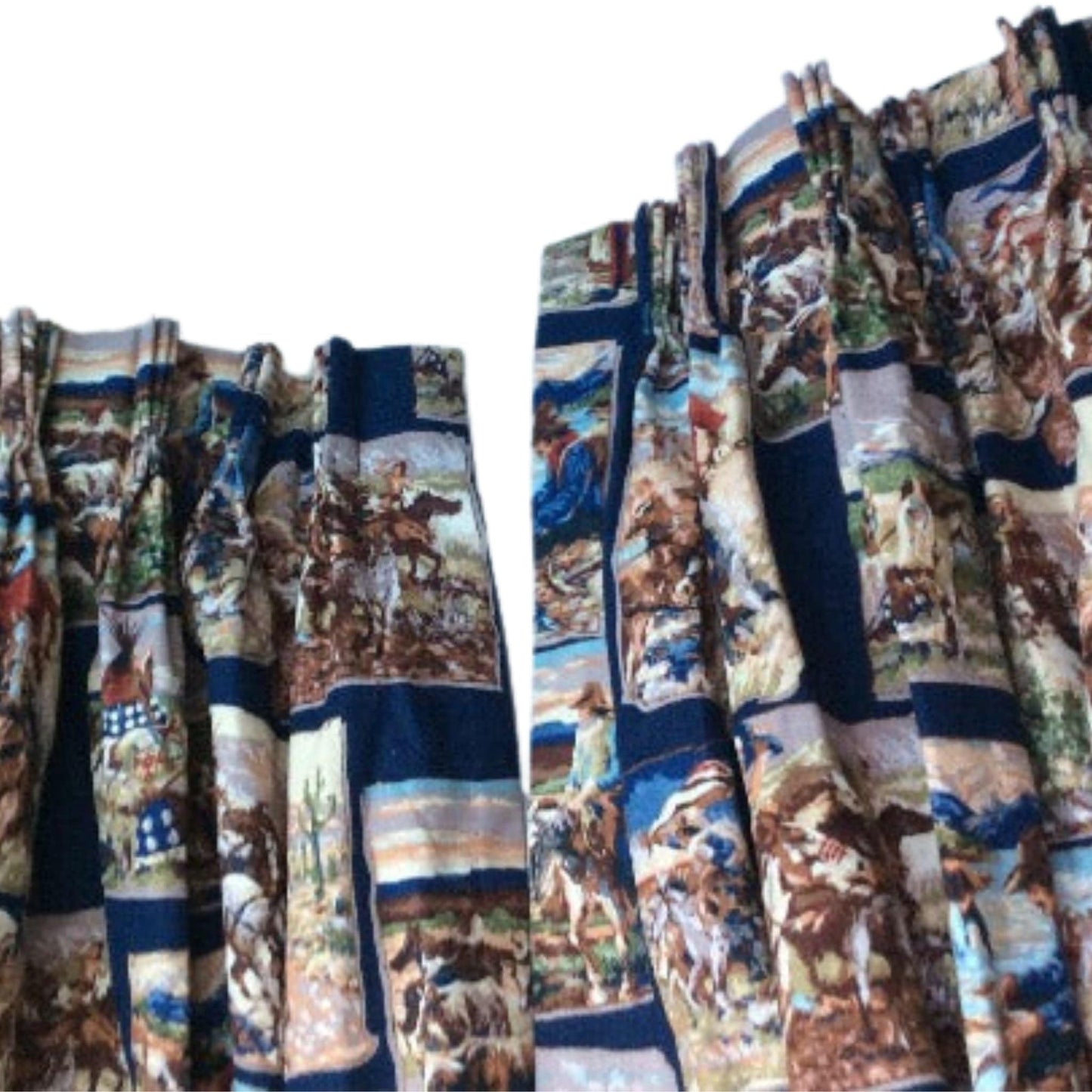 These Bloomcraft barkcloth curtains feature authentic southwestern cowboy imagery with detailed pictorial scenes showcasing ranch life and western landscapes. The substantial barkcloth fabric provides rich texture and excellent drape, while the full lining ensures privacy and light control. Custom-made construction demonstrates superior craftsmanship with attention to period-appropriate styling and durability.