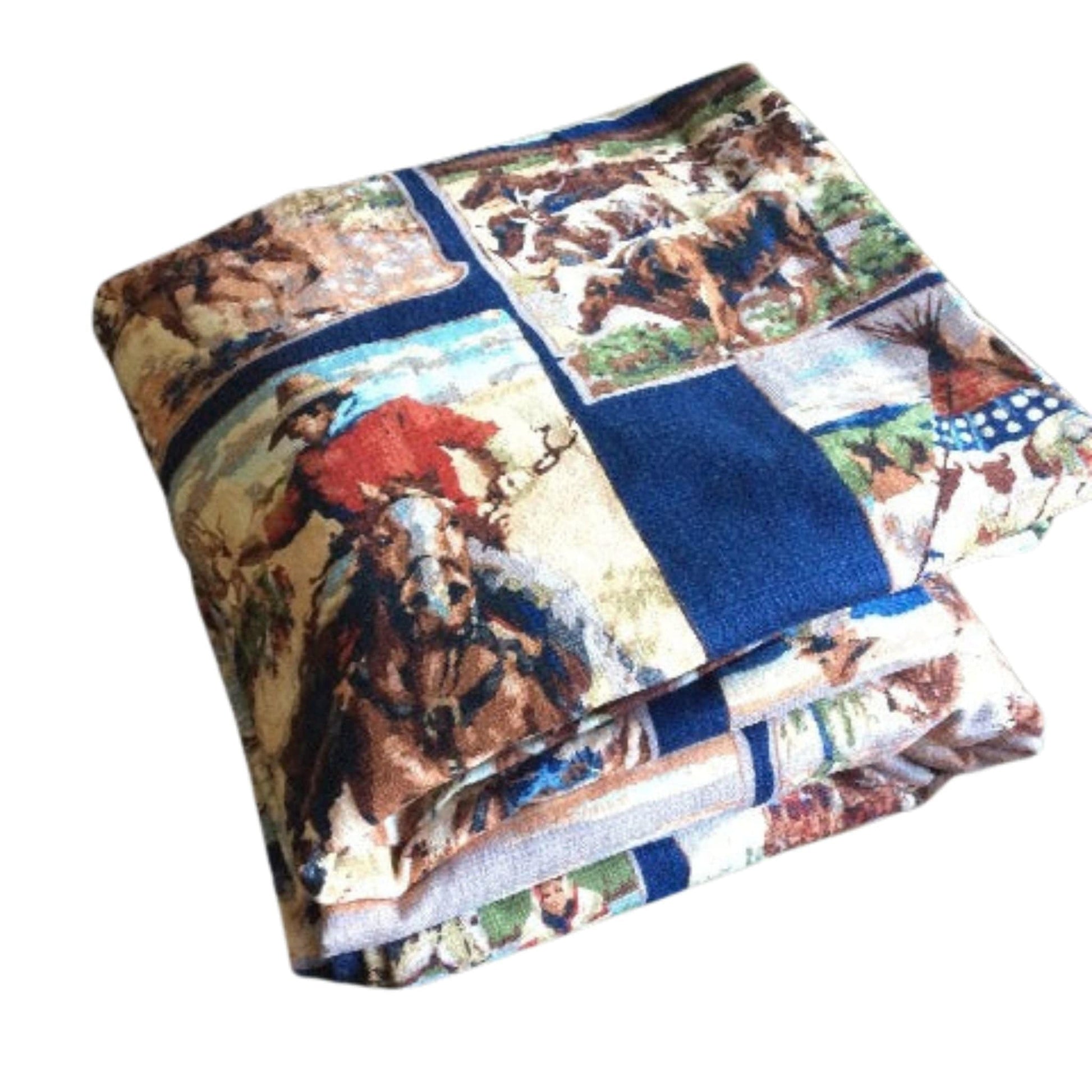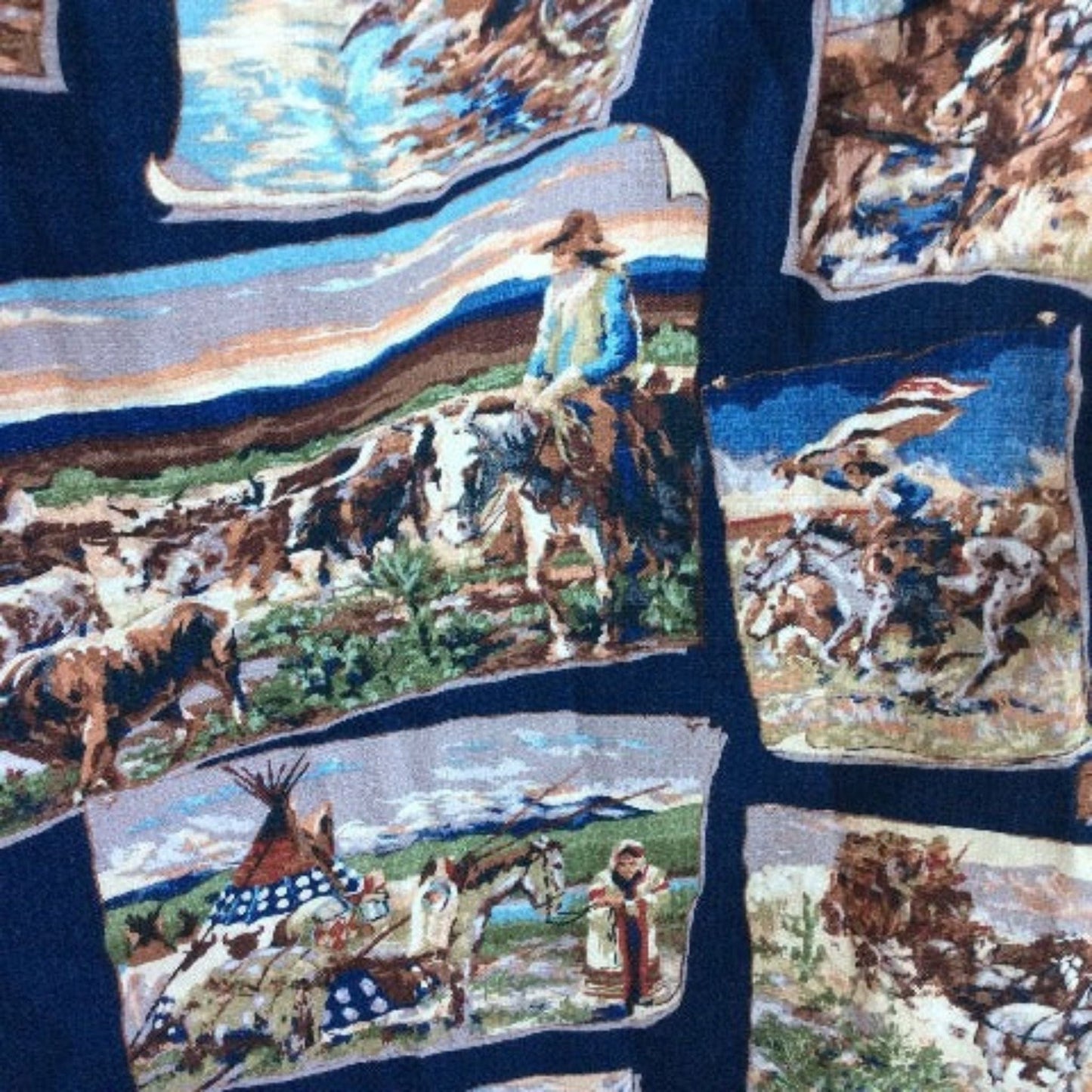 Cowboy Barkcloth Curtains showcase exceptional vintage Bloomcraft fabric craftsmanship with authentic southwestern pictorial themes and rich barkcloth texture. These custom-made curtain panels feature detailed cowboy and western motifs in a vibrant multicolor palette on navy blue base, representing the finest mid-century textile artistry. The fully lined construction and substantial barkcloth material provide excellent light control and durability for both decorative and functional applications.