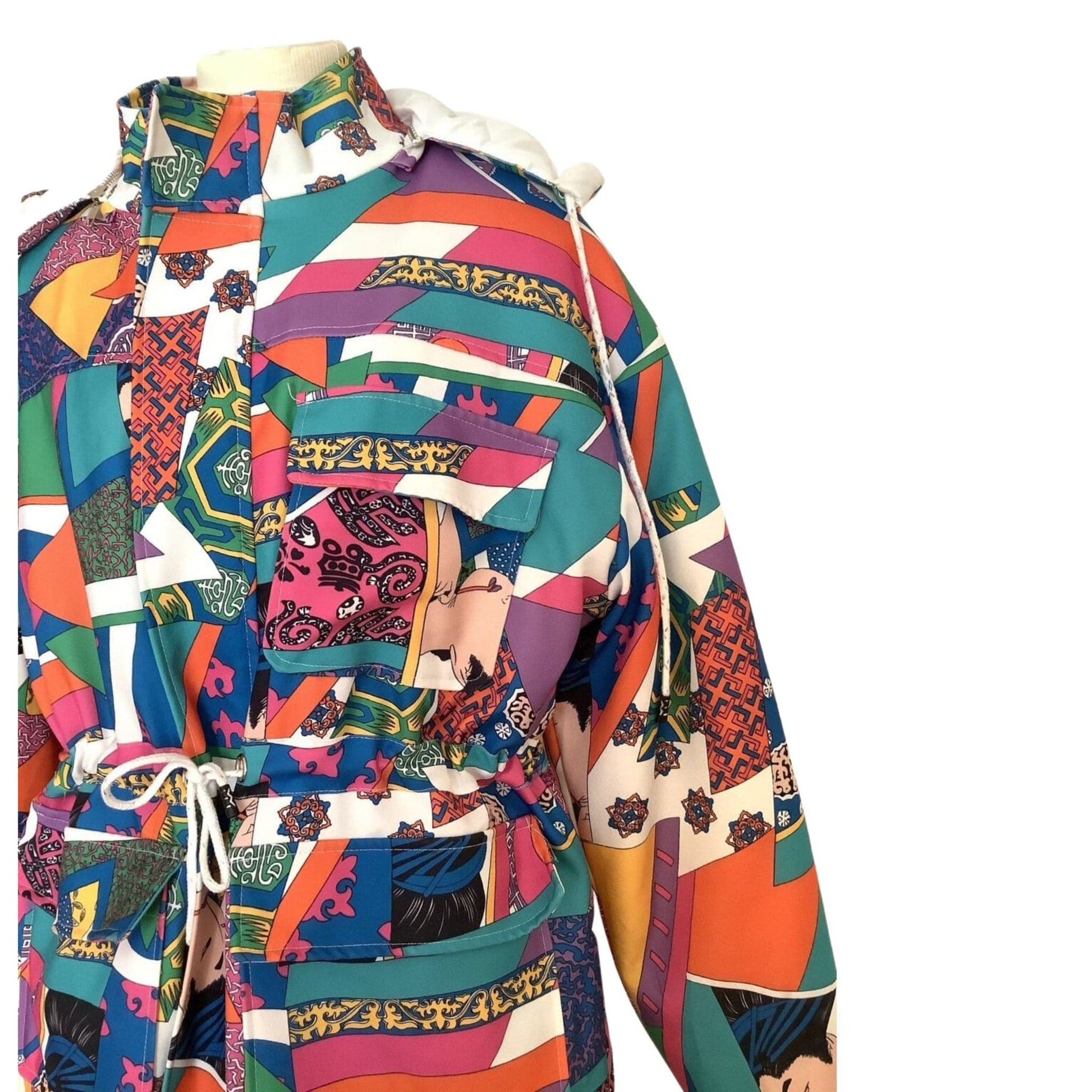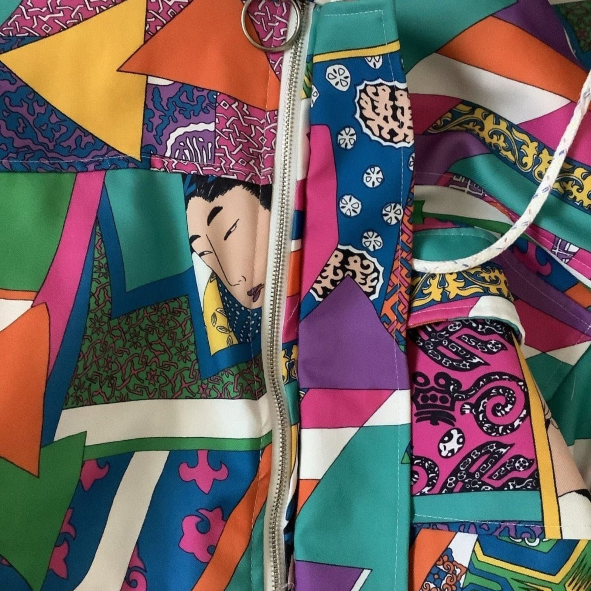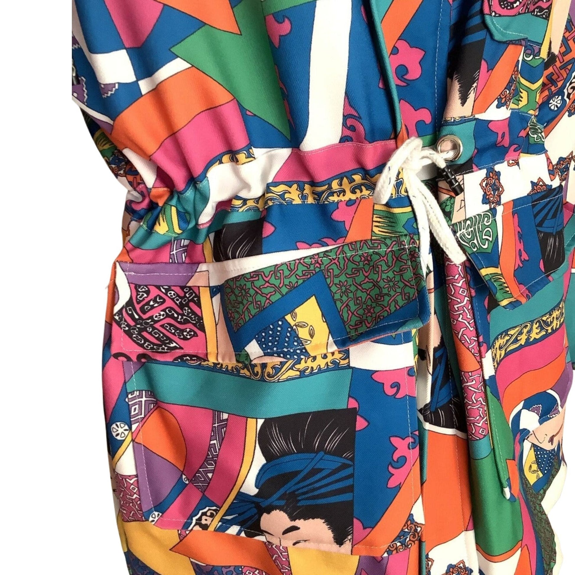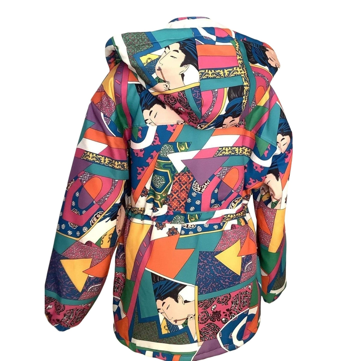 Geisha Themed Jacket represents authentic Y2K Harajuku street-wear with distinctive colorful traditional Japanese Geisha graphics that defined funky vintage outerwear culture. This new old stock jacket by Nizhesi brand remains never worn in excellent condition without issues or damage, featuring detachable hood, front pockets, and adjustable waist string that demonstrate the functional design characteristic of Japanese street fashion. The authentic Japanese manufacturing and collectible Y2K styling capture the essence of Harajuku culture and traditional Japanese artistry, making this jacket perfect for collectors and street-wear enthusiasts seeking unique cultural fashion pieces.