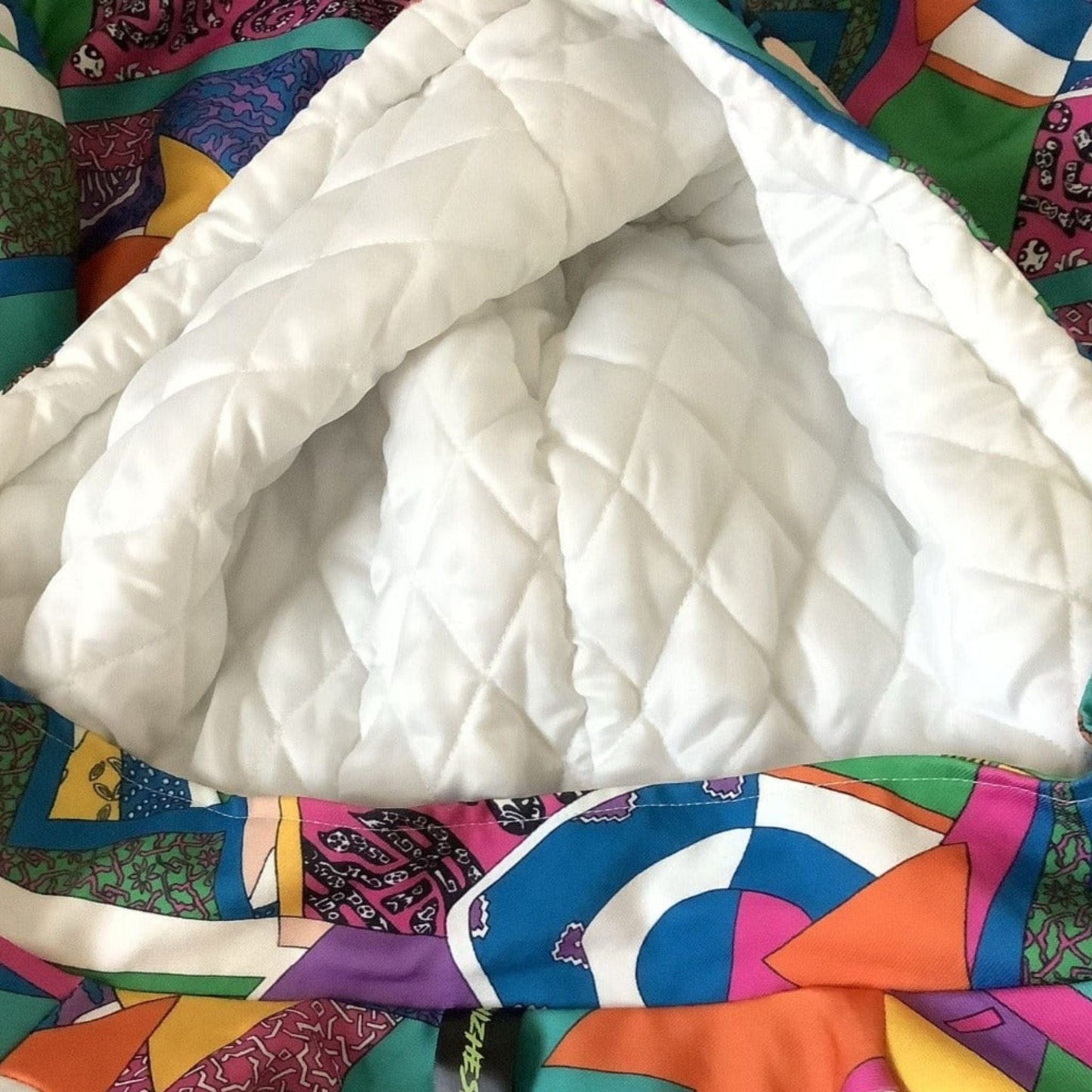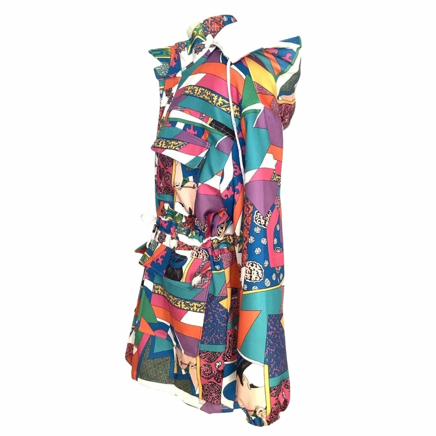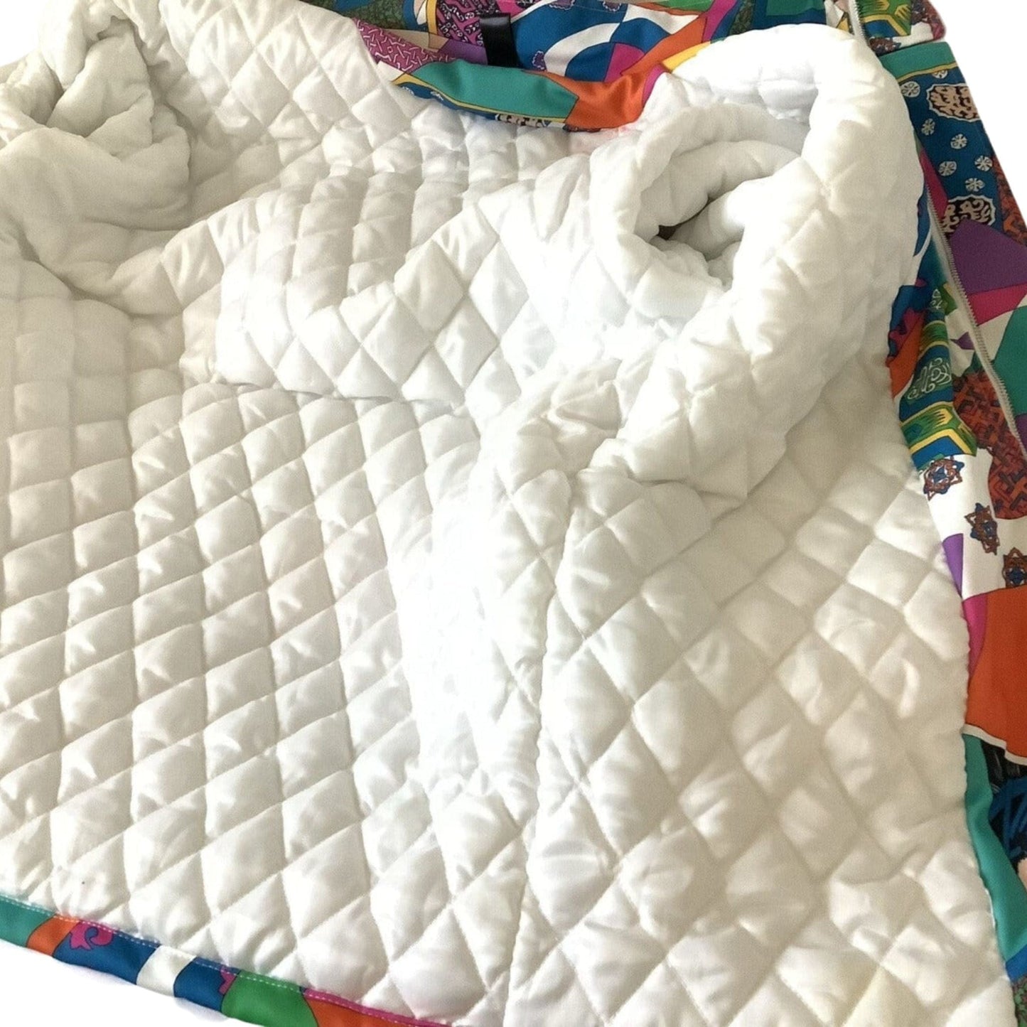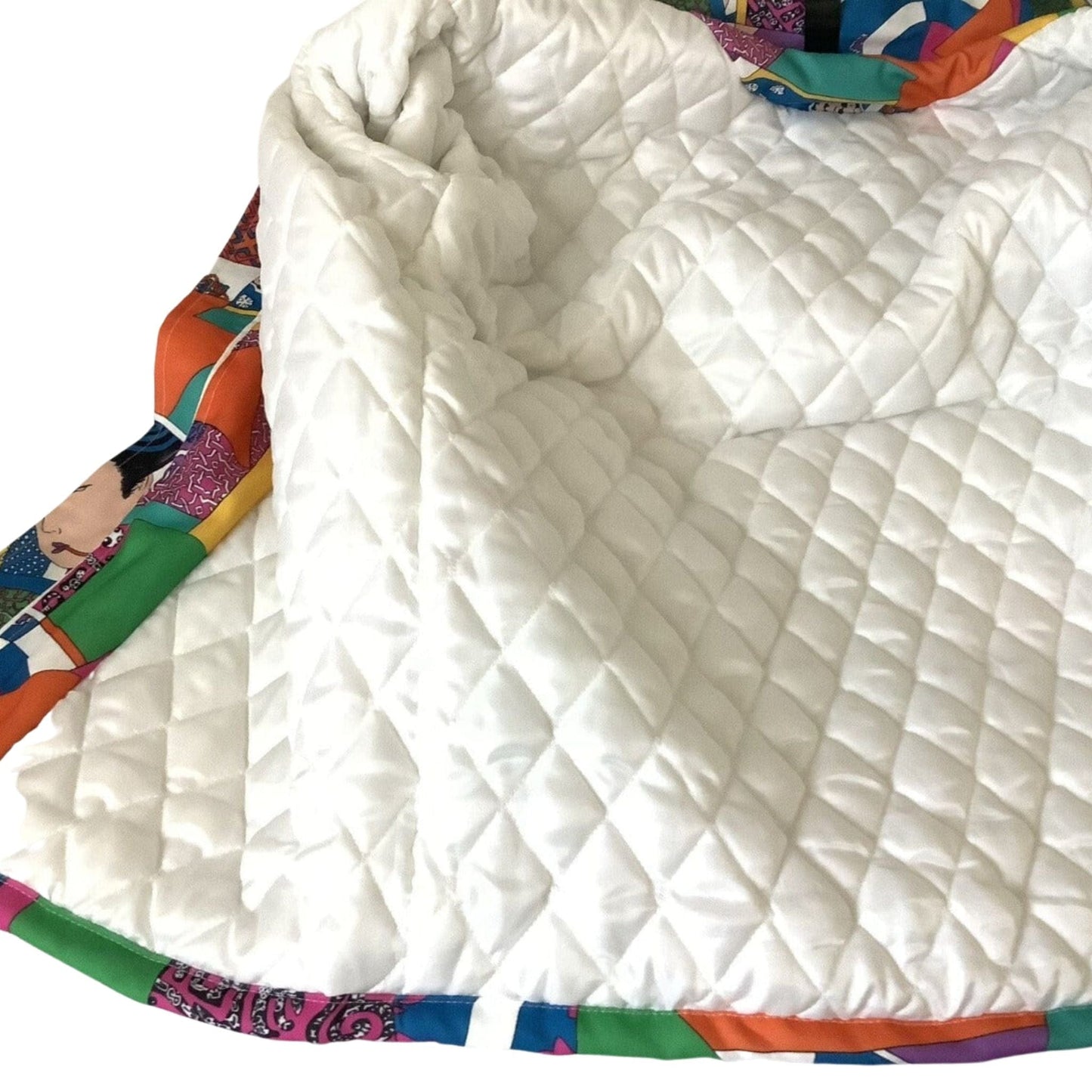 Geisha Themed Jacket represents authentic Y2K Harajuku street-wear with distinctive colorful traditional Japanese Geisha graphics that defined funky vintage outerwear culture. This new old stock jacket by Nizhesi brand remains never worn in excellent condition without issues or damage, featuring detachable hood, front pockets, and adjustable waist string that demonstrate the functional design characteristic of Japanese street fashion. The authentic Japanese manufacturing and collectible Y2K styling capture the essence of Harajuku culture and traditional Japanese artistry, making this jacket perfect for collectors and street-wear enthusiasts seeking unique cultural fashion pieces.
