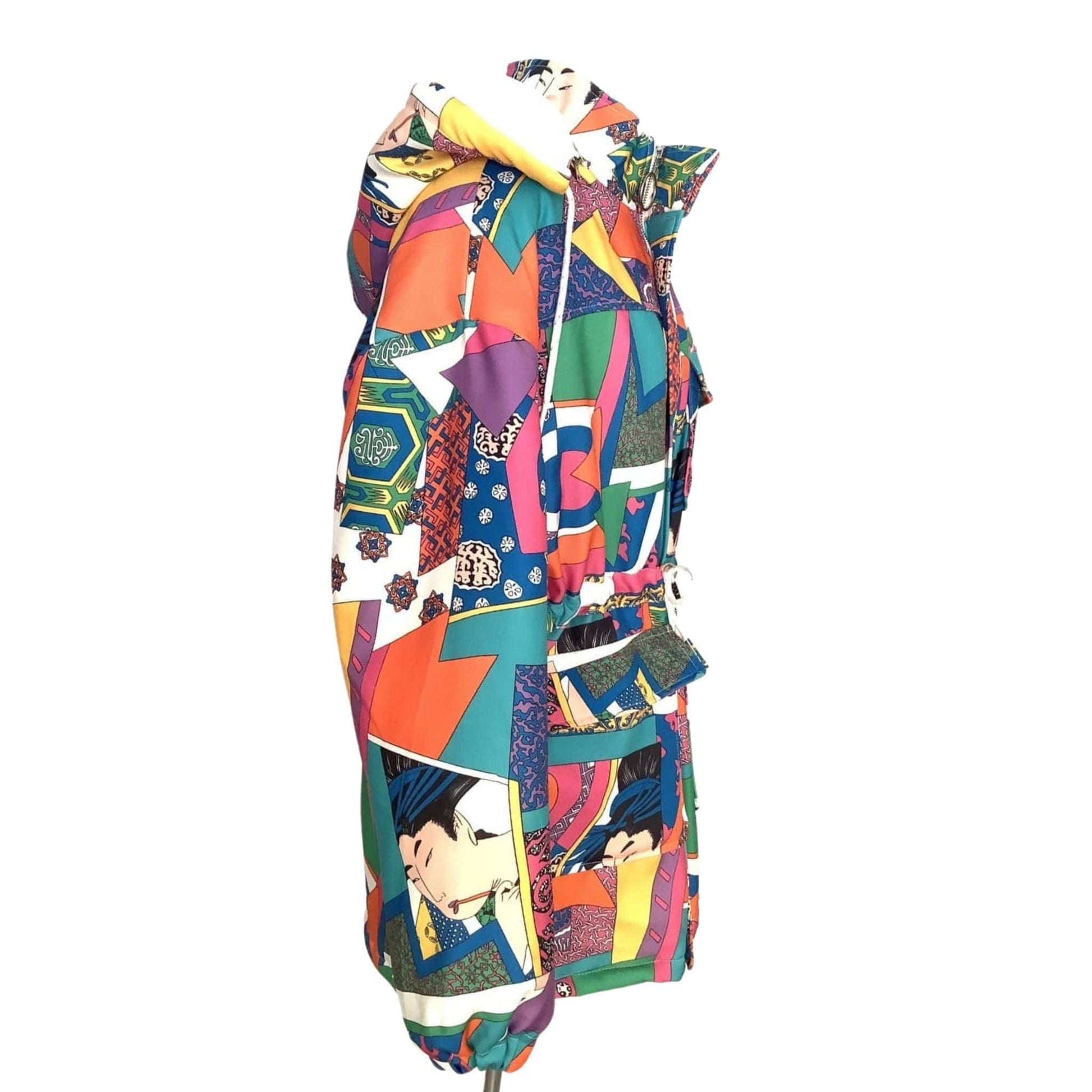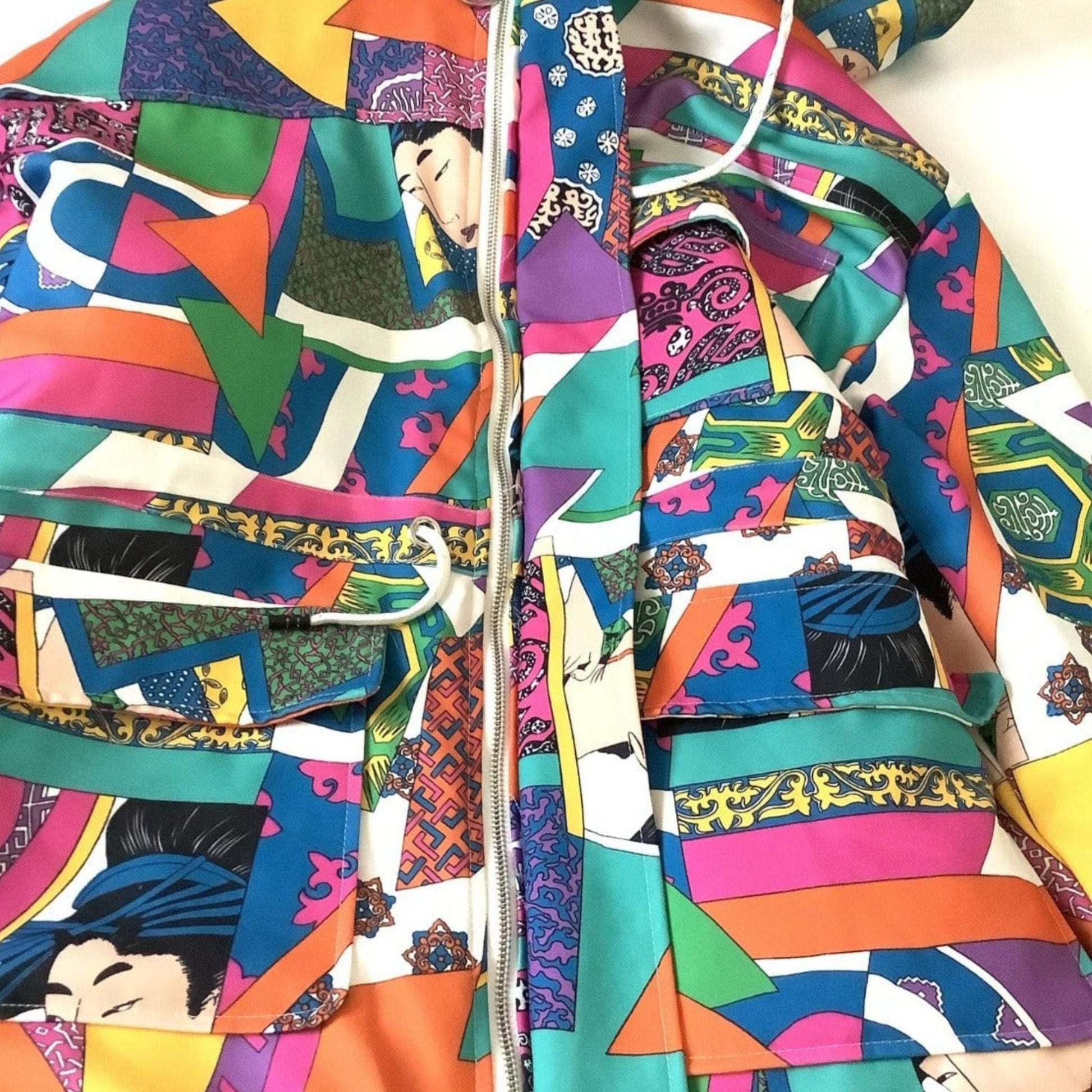 New old stock condition, never worn and maintaining pristine quality with all original construction details intact. The colorful traditional Japanese Geisha graphics remain vibrant and detailed, while the detachable hood and adjustable features function perfectly. Overall condition represents exceptional preservation of this collectible Y2K jacket, demonstrating the quality Japanese manufacturing and authentic Harajuku street-wear styling that makes this piece valuable for cultural fashion collectors and street-wear enthusiasts.