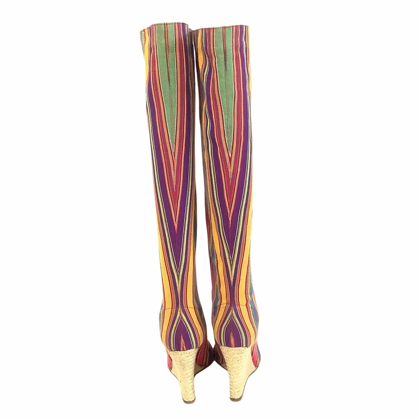 Christian Louboutin Espadrille Boots showcase the iconic designer's bold aesthetic with vibrant multicolor stripes and over-knee silhouette. These statement boots feature canvas fabric construction with leather soles, embodying the luxury craftsmanship Louboutin is renowned for worldwide.
