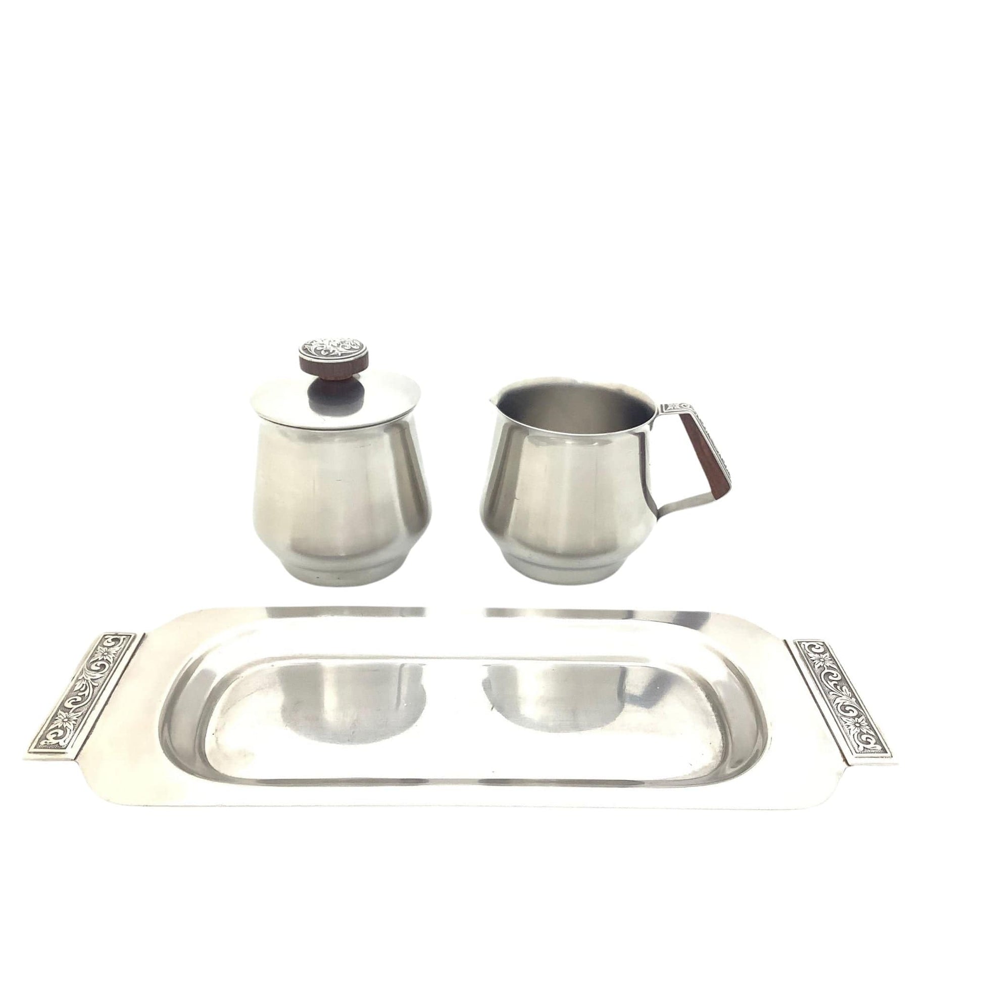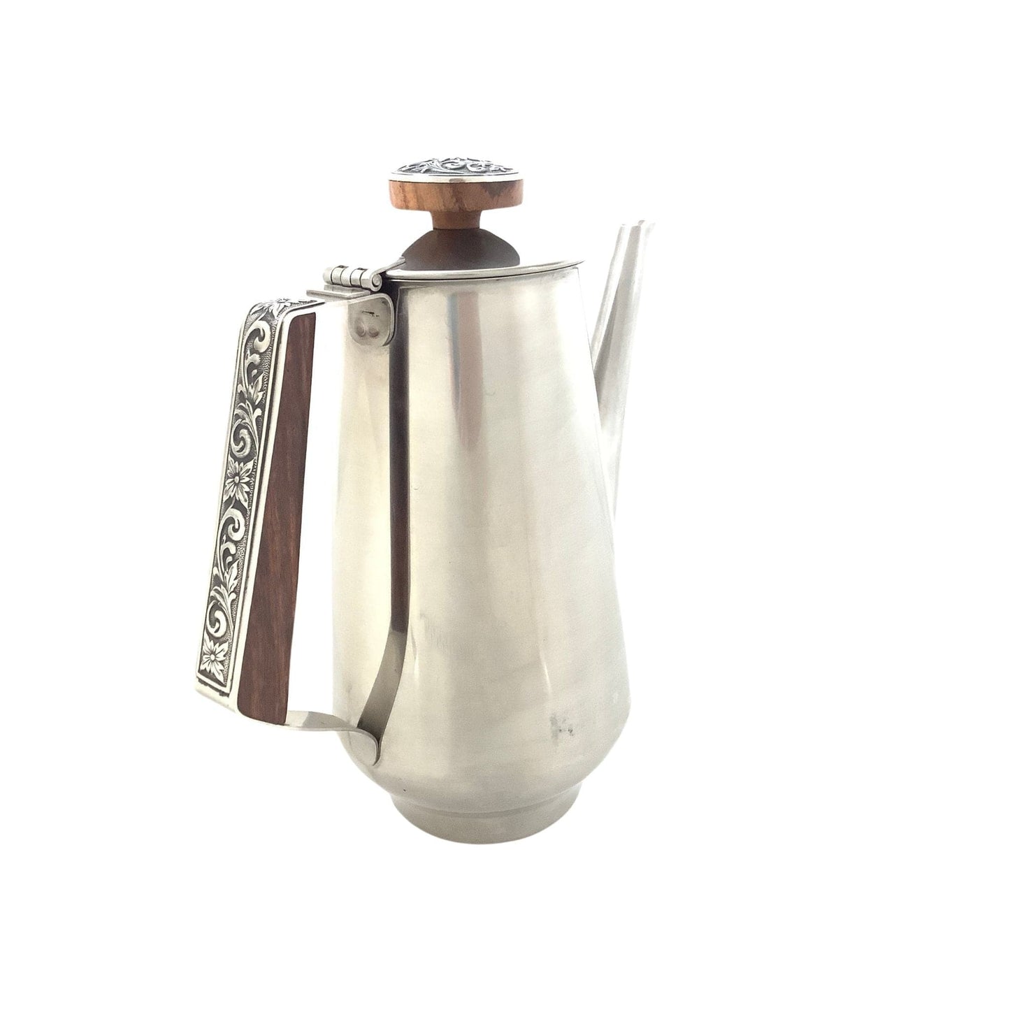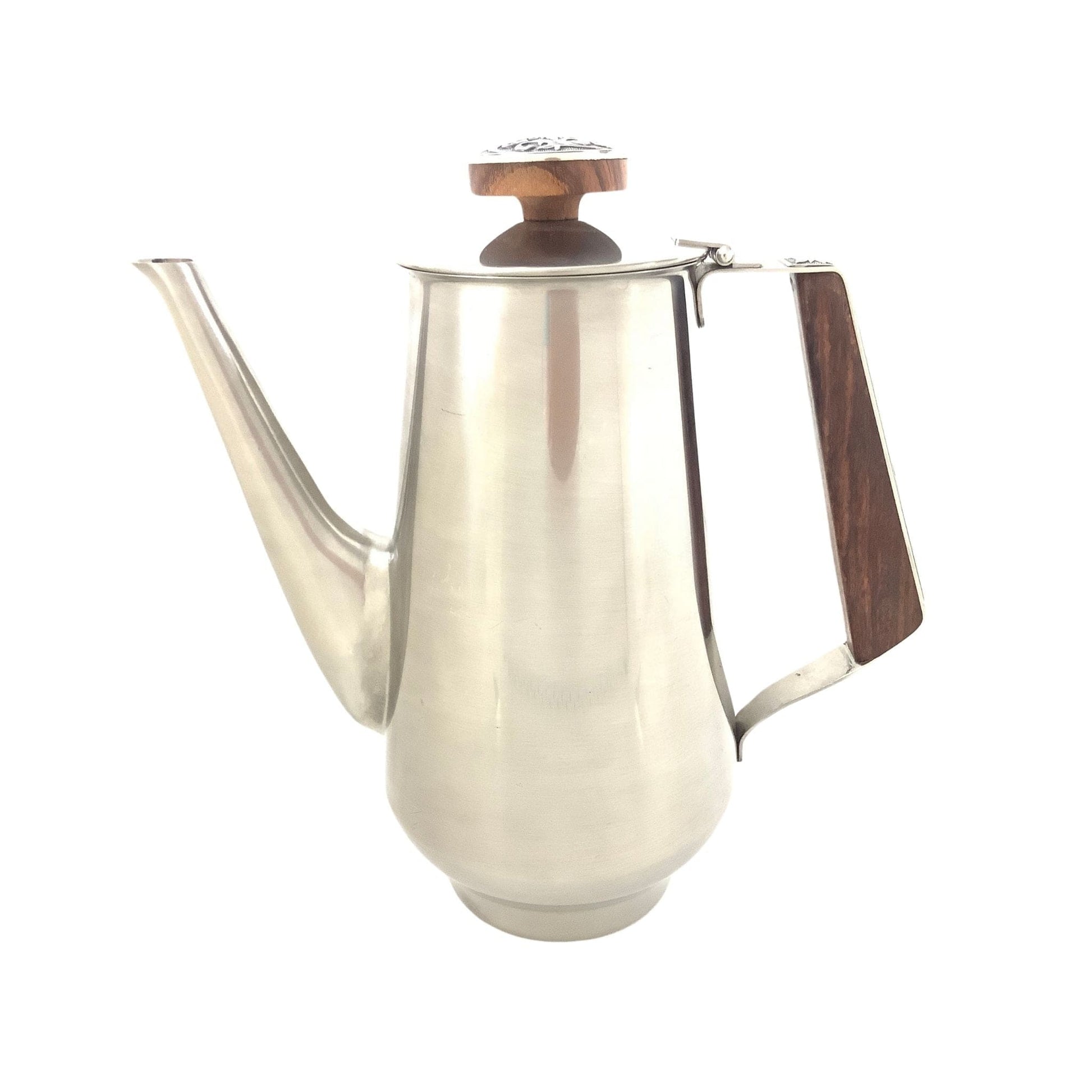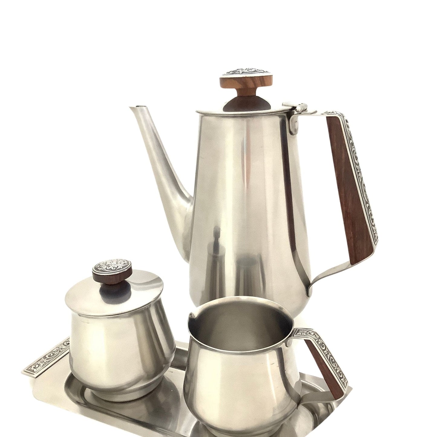 This Mid Century Coffee Set features stainless steel construction with teak decorative teak wood details, the tray's handles are engraved all pieces are decorative and practical as a functioning beverage serving set, perfect to adorn your cupboard and kitchen table, complements a minimalist as well as a mid century modern elegance with a sleek, timeless design. Made in Japan, it comes in excellent pre-owned condition with only minor smudges and scratches.