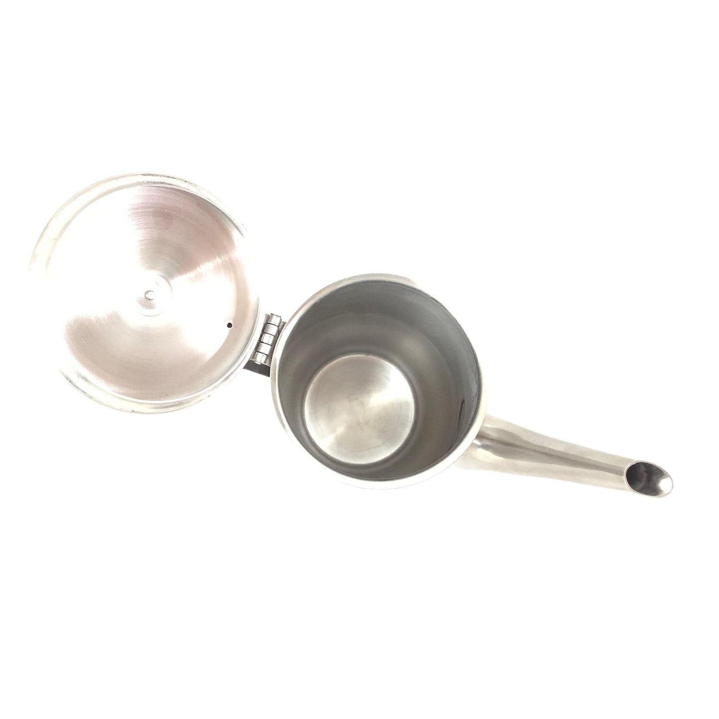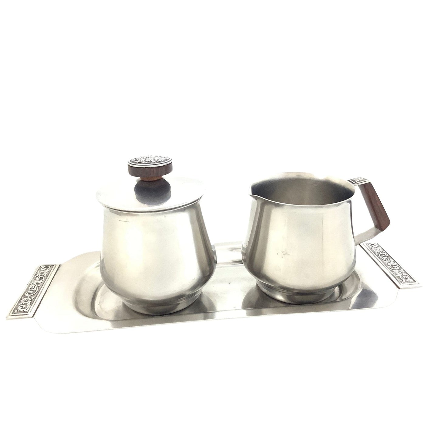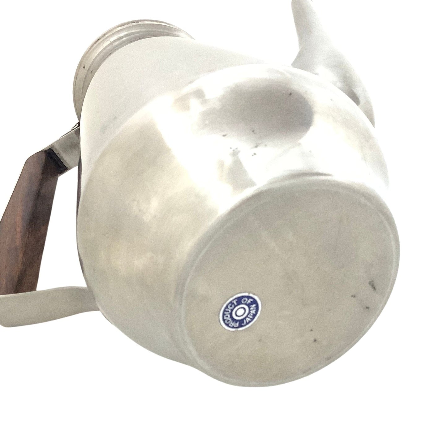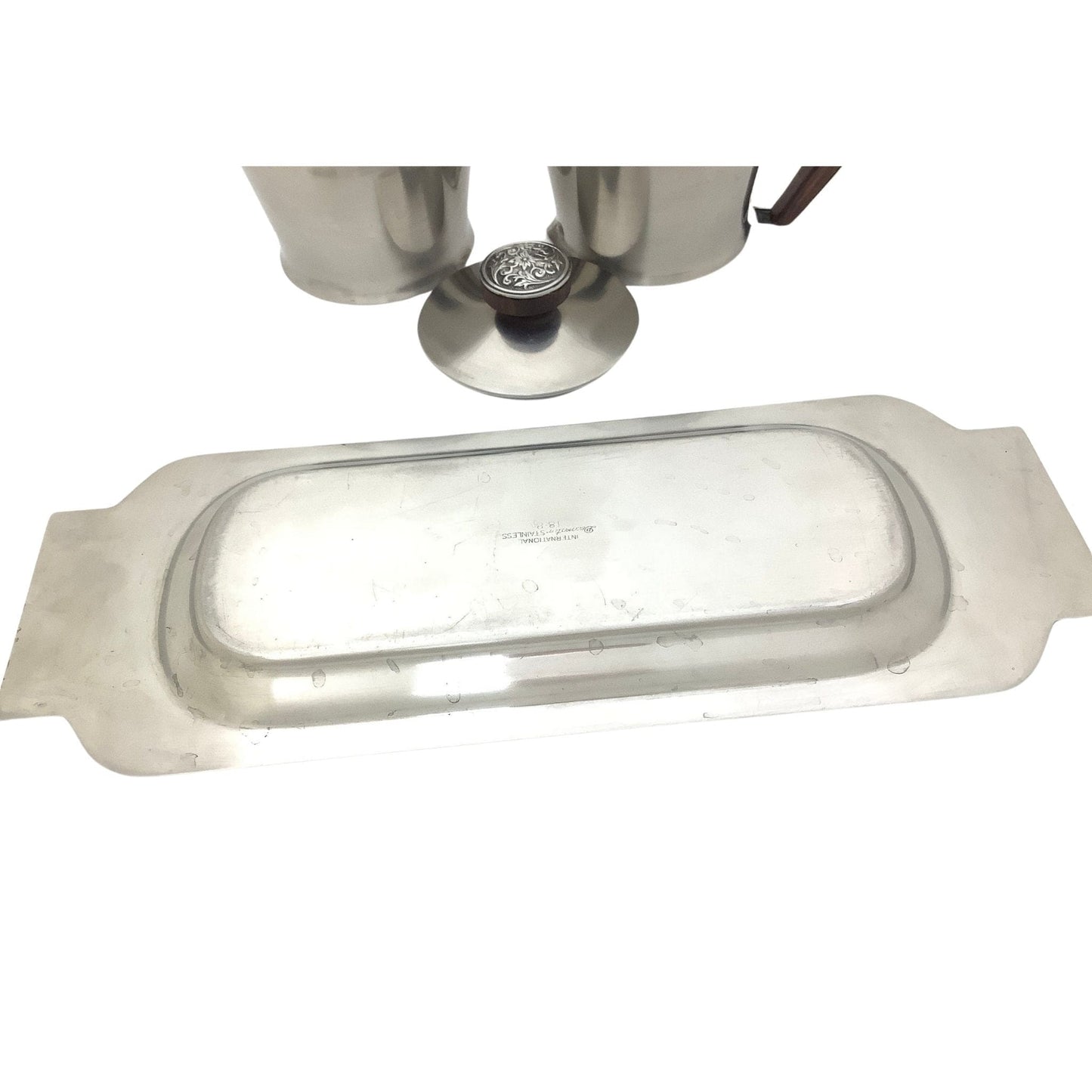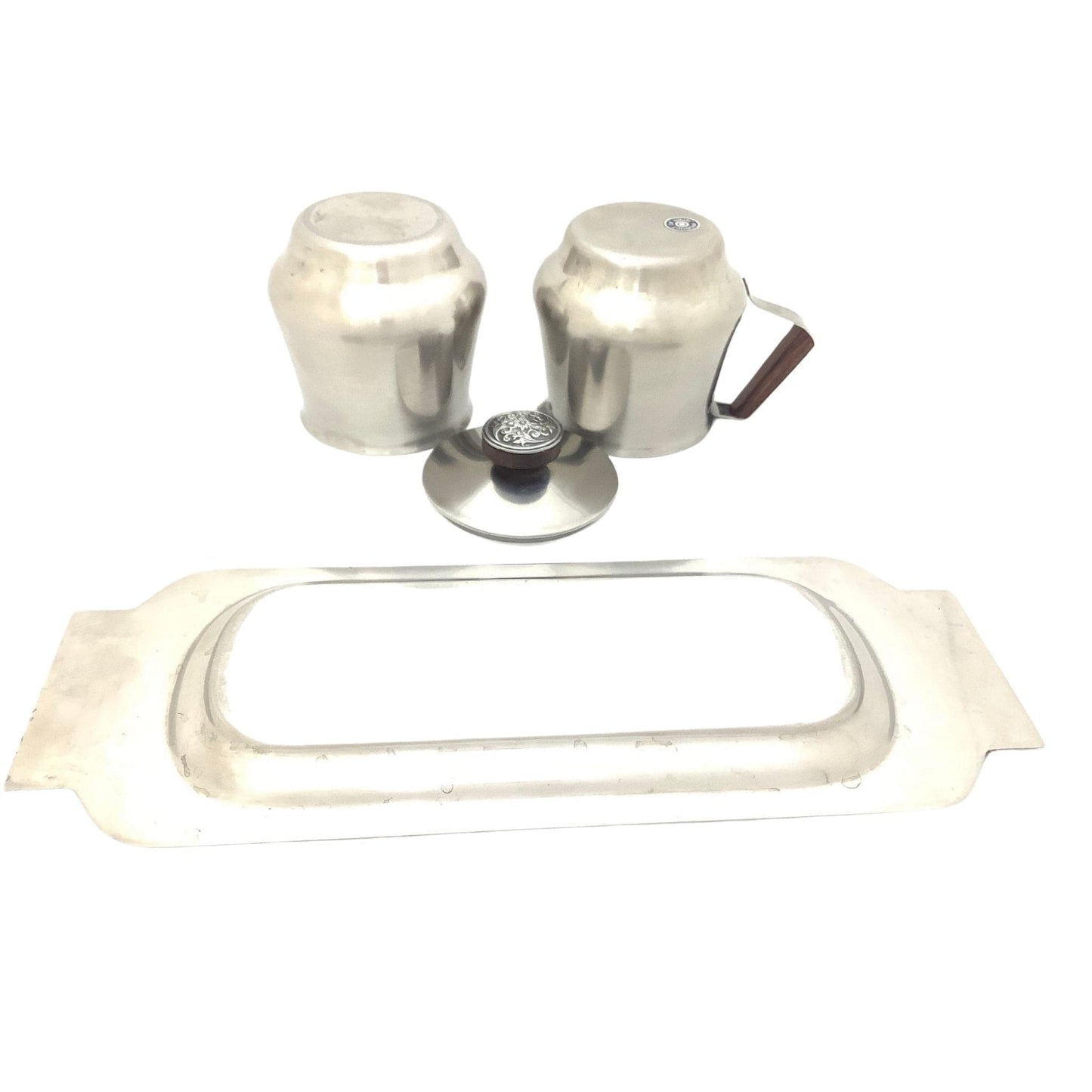 This Mid Century Coffee Set features stainless steel construction with teak decorative teak wood details, the tray's handles are engraved all pieces are decorative and practical as a functioning beverage serving set, perfect to adorn your cupboard and kitchen table, complements a minimalist as well as a mid century modern elegance with a sleek, timeless design. Made in Japan, it comes in excellent pre-owned condition with only minor smudges and scratches.