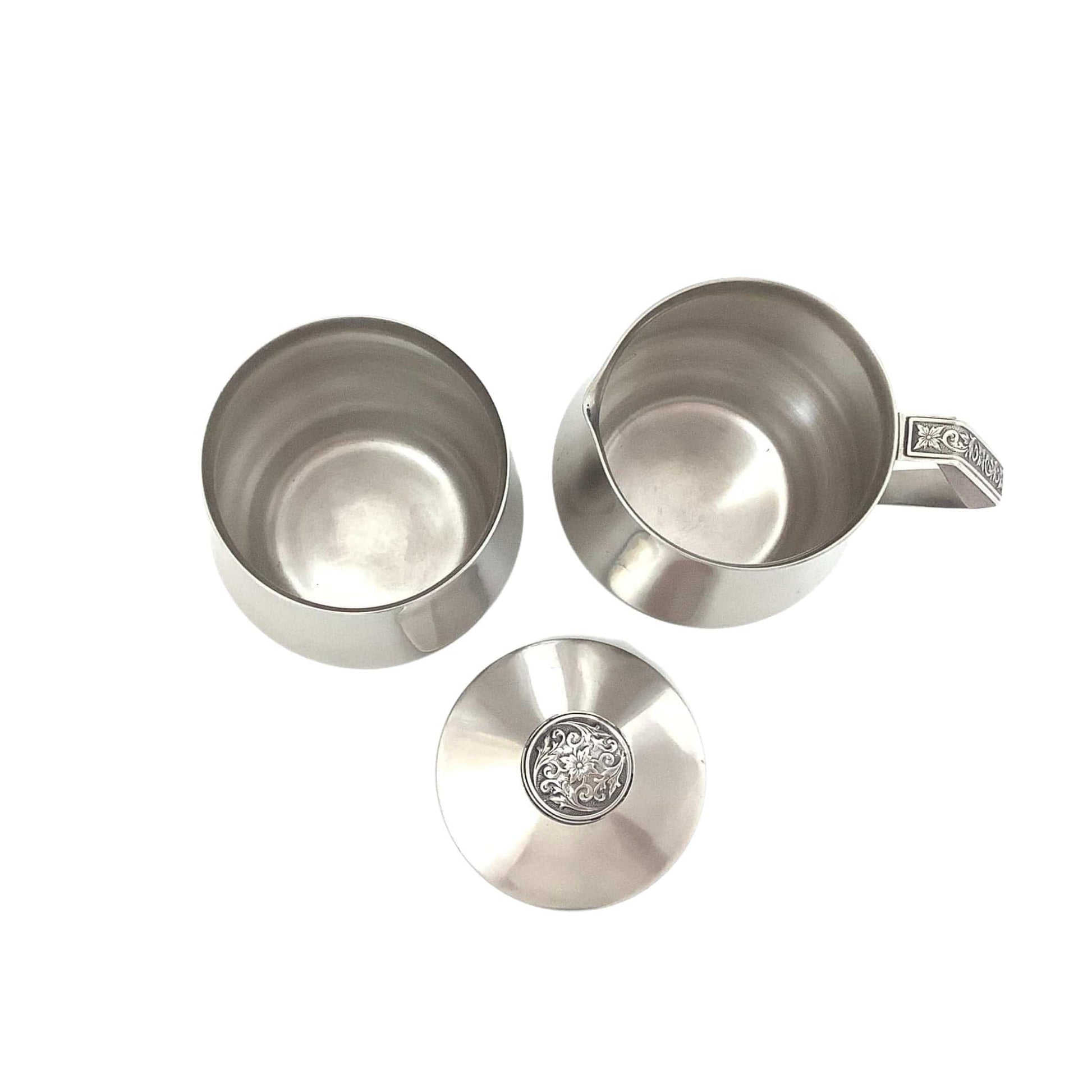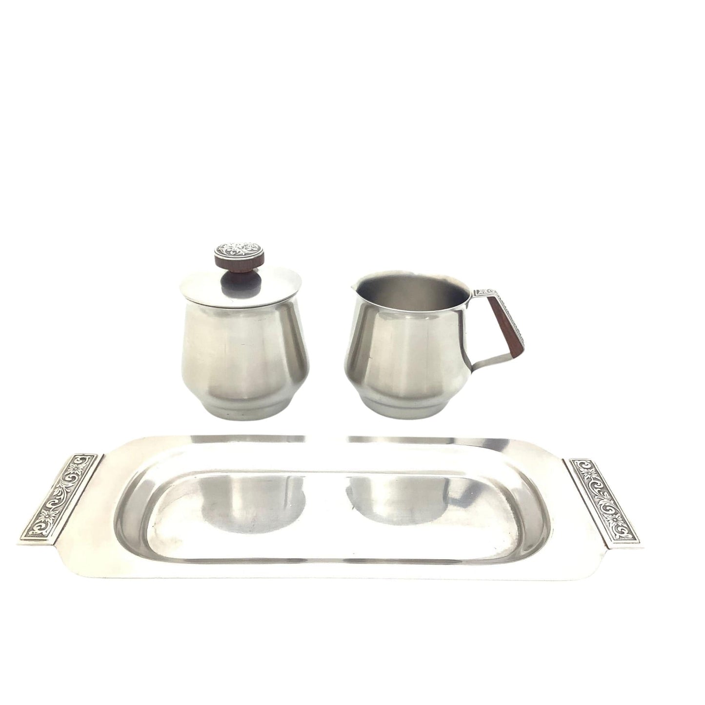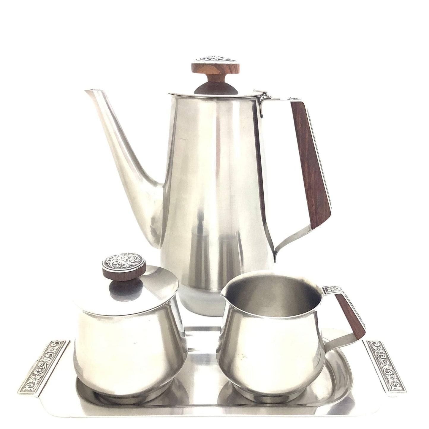 Mid Century Coffee Set 3 piece ensemble includes coffee pot, lidded sugar bowl, creamer and serving tray, genuine vintage 1950s Rogers Insilco pre-owned good condition with visual signs of wear without damage or issues, made in the USA.