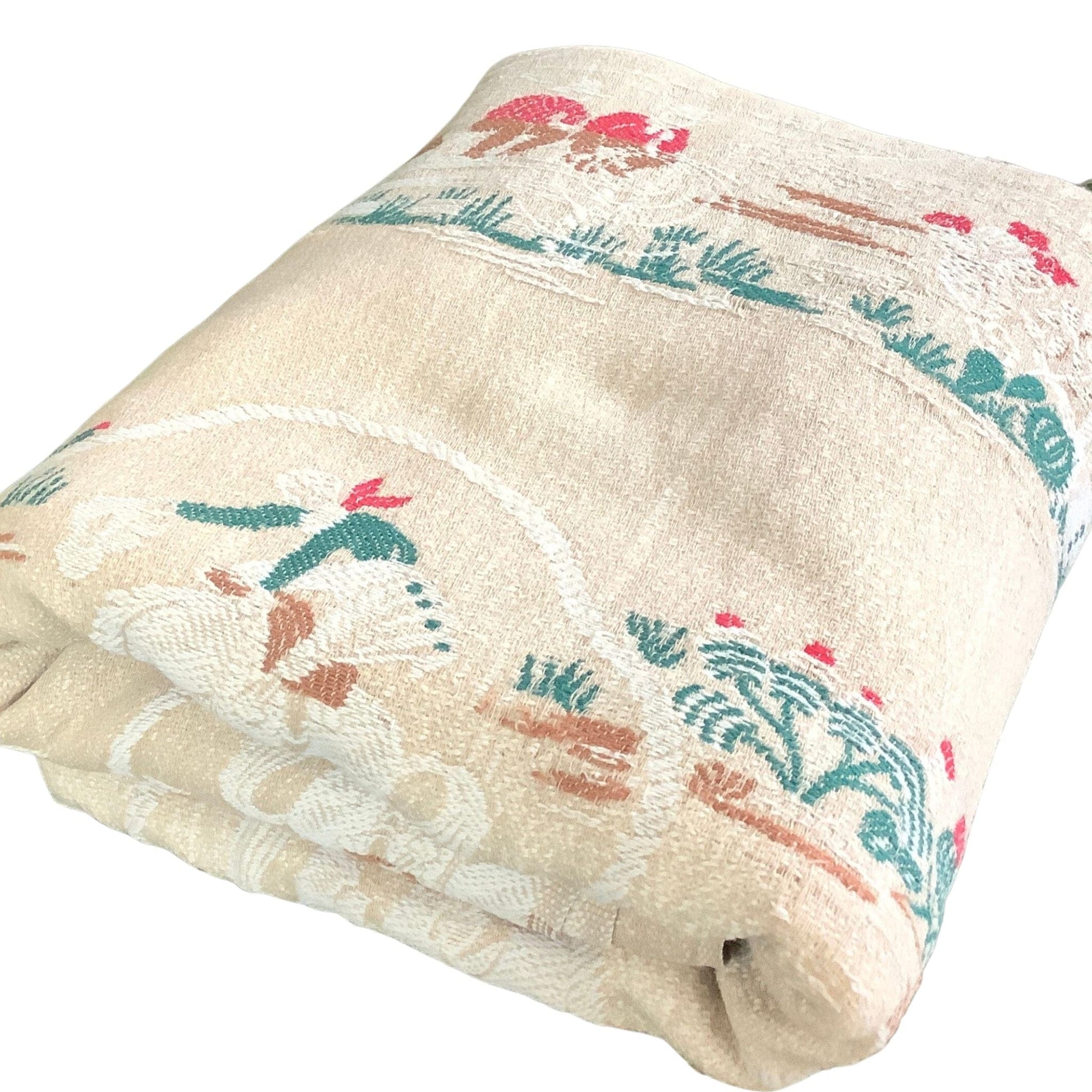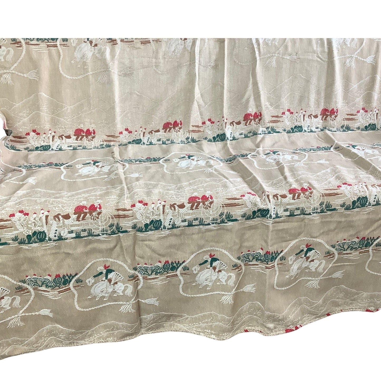 Ranch Themed Bedspread exemplifies authentic 1950s southwestern textile craftsmanship in the renowned Bates tradition. This collectible bedspread features traditional western motifs including cowboys, ropes, fences, horses, and mountains, creating a comprehensive ranch scene that captures the essence of vintage southwestern design. The smaller twin size dimensions (66" wide x 76" length) make it perfect for various decorative applications while maintaining authentic period styling.