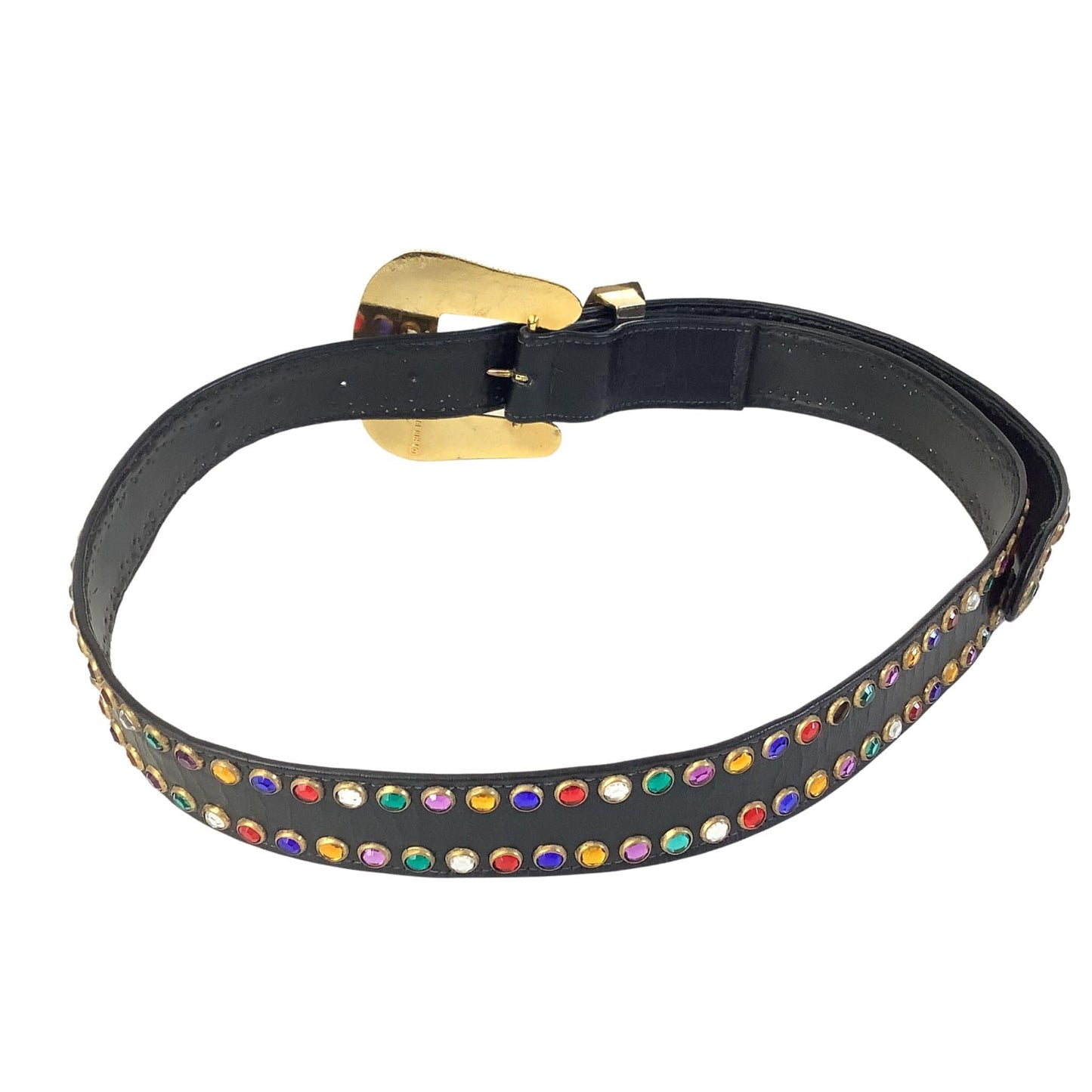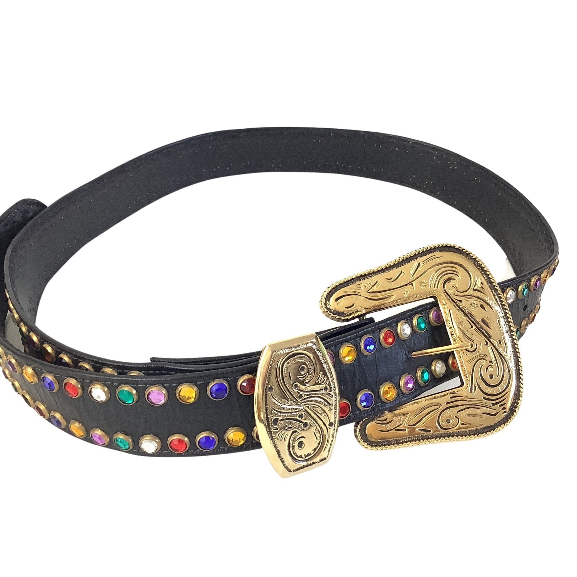 Long length fold-under style design provides versatile sizing options and elegant drape. Multicolored rhinestone studded details create dazzling visual impact throughout the belt length. Premium black leather construction with gold hardware ensures lasting durability and sophisticated appeal.