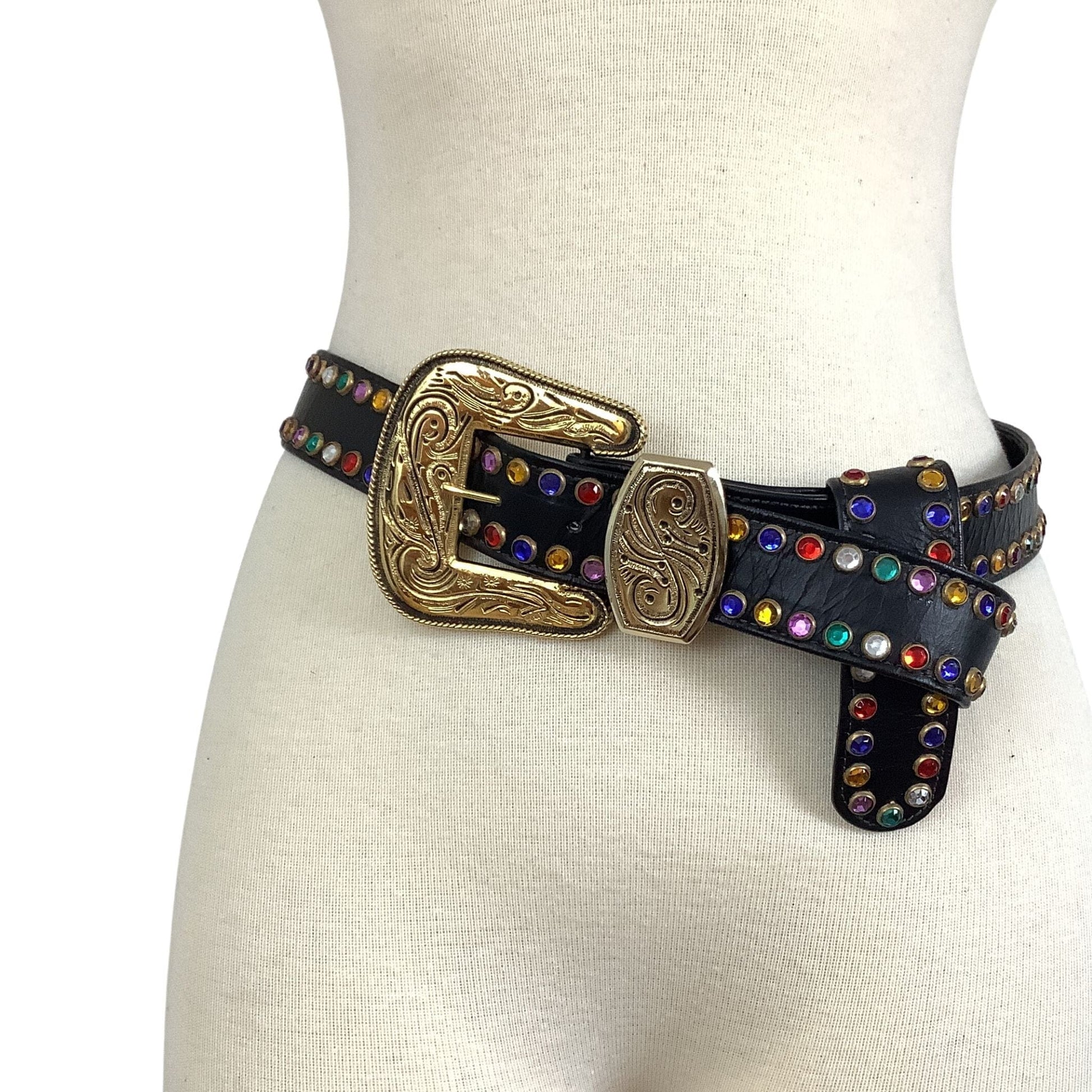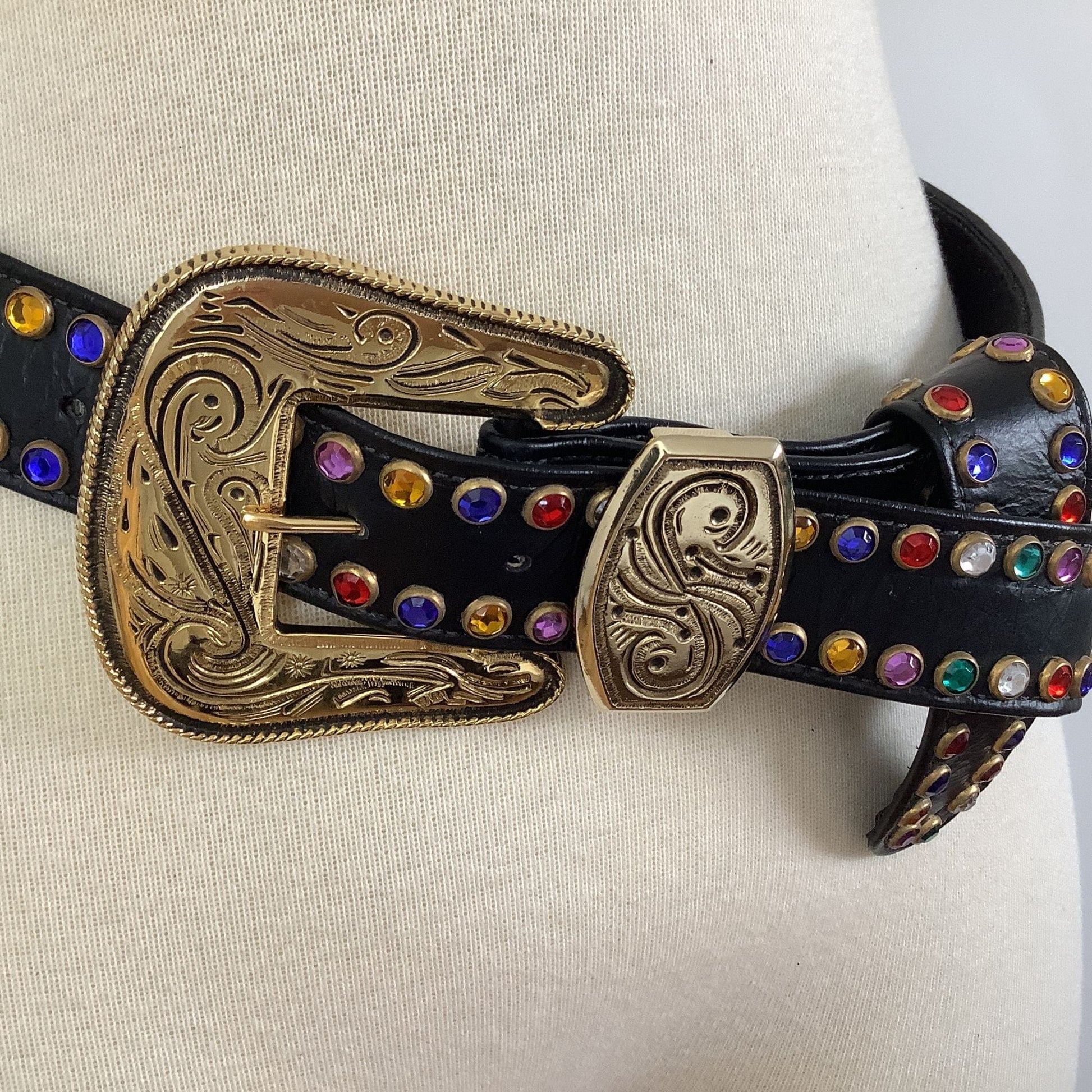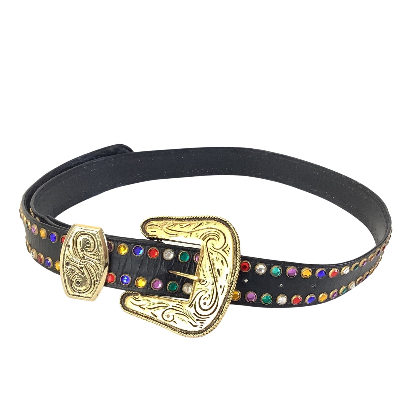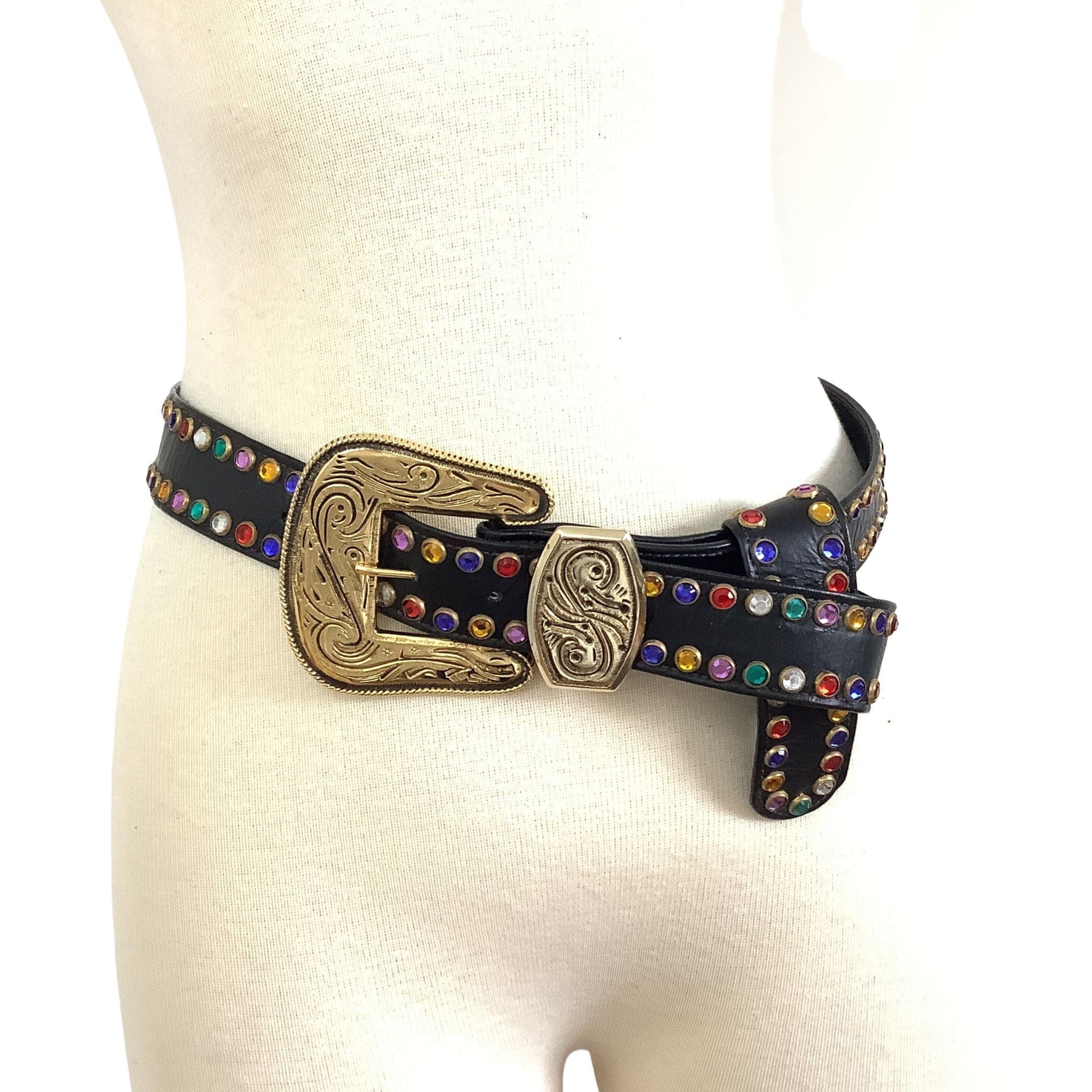 St Maarten Western Belt showcases authentic 1980s glamour with multicolored rhinestone embellishments that capture the era's bold fashion aesthetic. This premium accessory combines sophisticated western styling with luxurious materials, creating a statement piece for discerning vintage collectors.