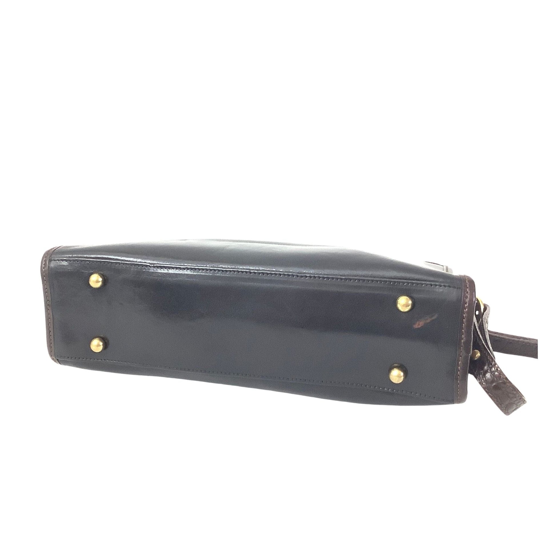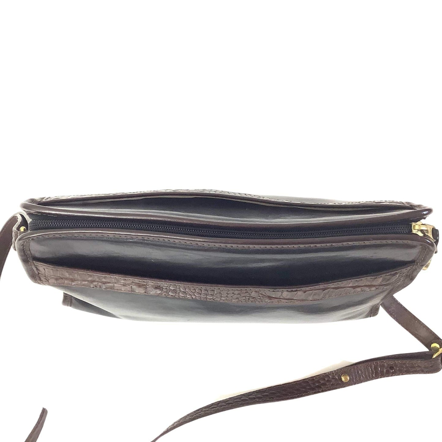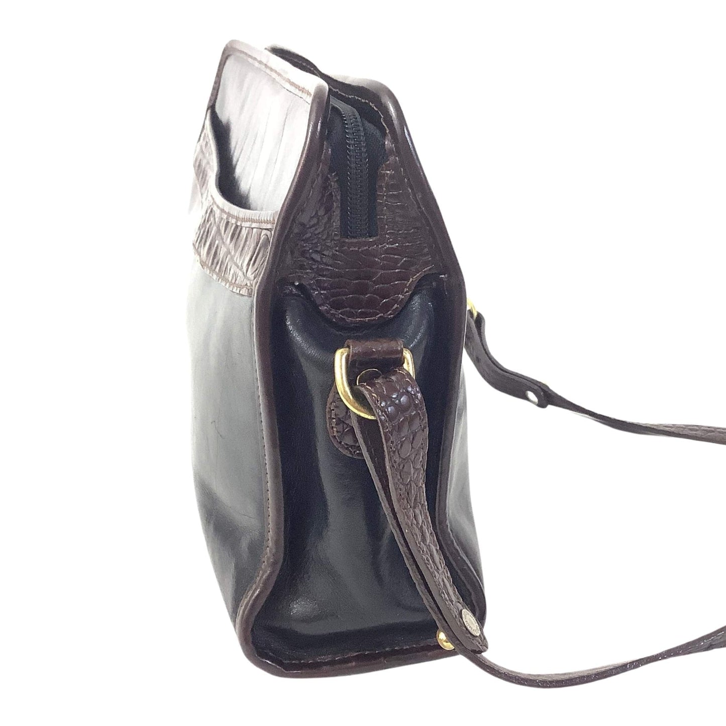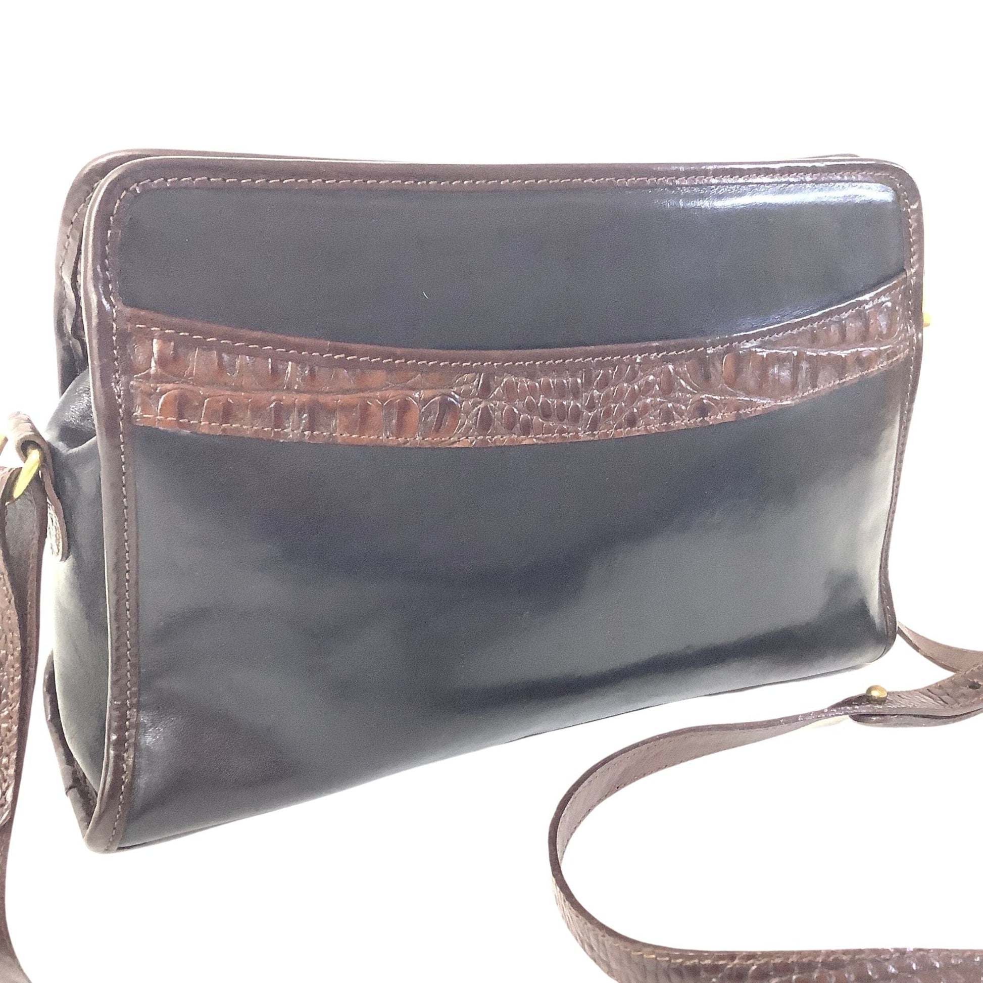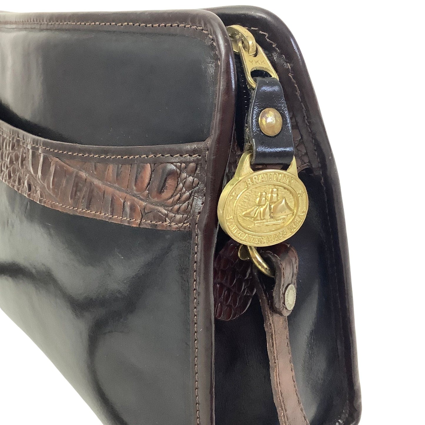 Brahmin Handbags represent the pinnacle of American luxury leather craftsmanship, combining innovative design with traditional techniques that defined premium accessories in the 1990s. This moc croc handbag showcases the brand's signature attention to detail with smooth black leather construction and distinctive brown crocodile-embossed trim that exemplifies sophisticated elegance and timeless style.