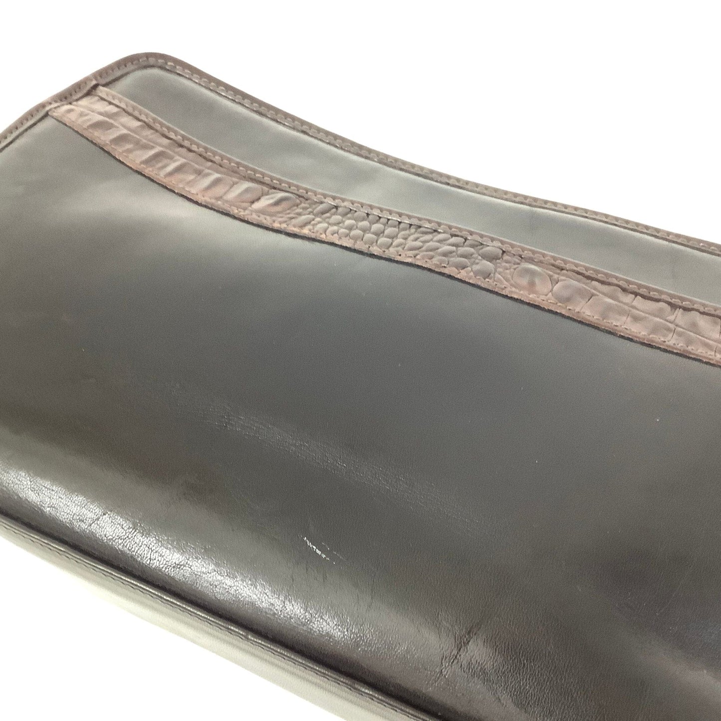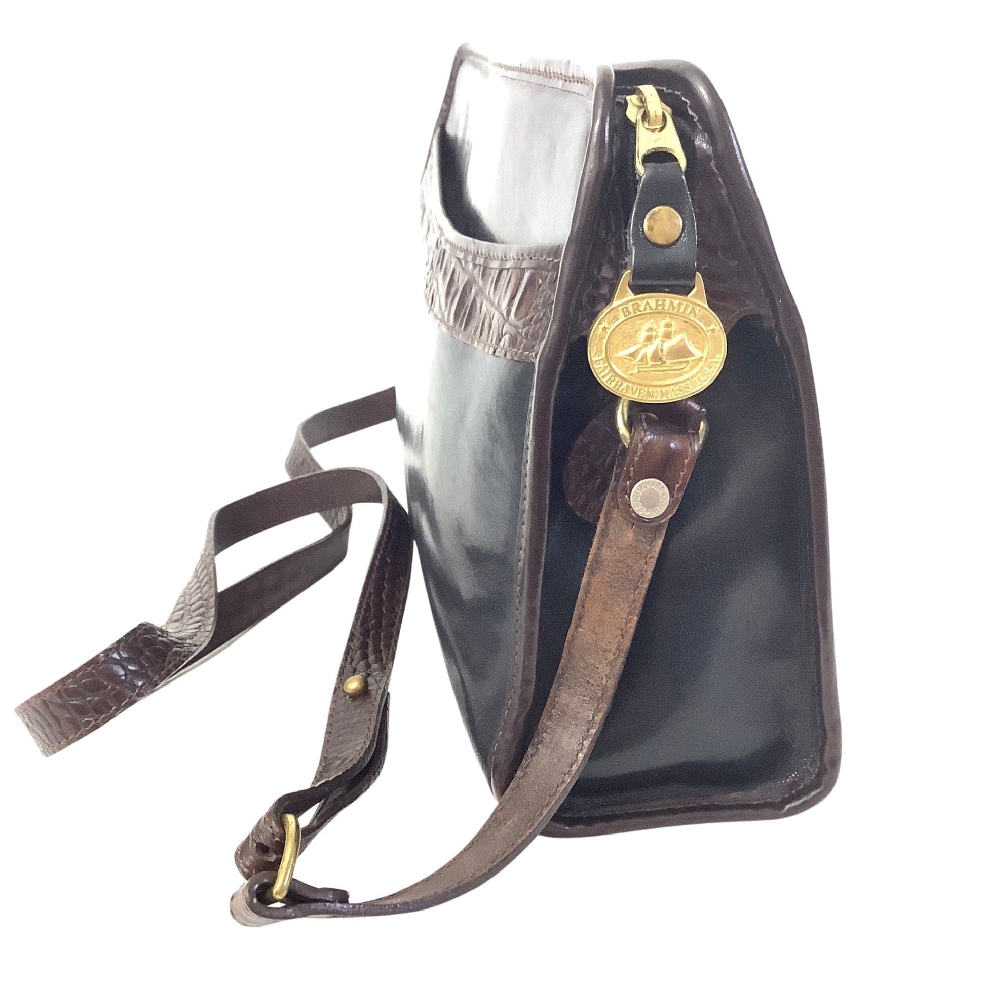 This pre-owned Brahmin handbag displays gentle wear patterns consistent with its vintage age and quality construction. The black leather maintains excellent structural integrity with minor surface patina that enhances its authentic character. The moc croc detailing remains well-defined, and the hardware functions smoothly. Overall condition reflects careful use and proper maintenance.