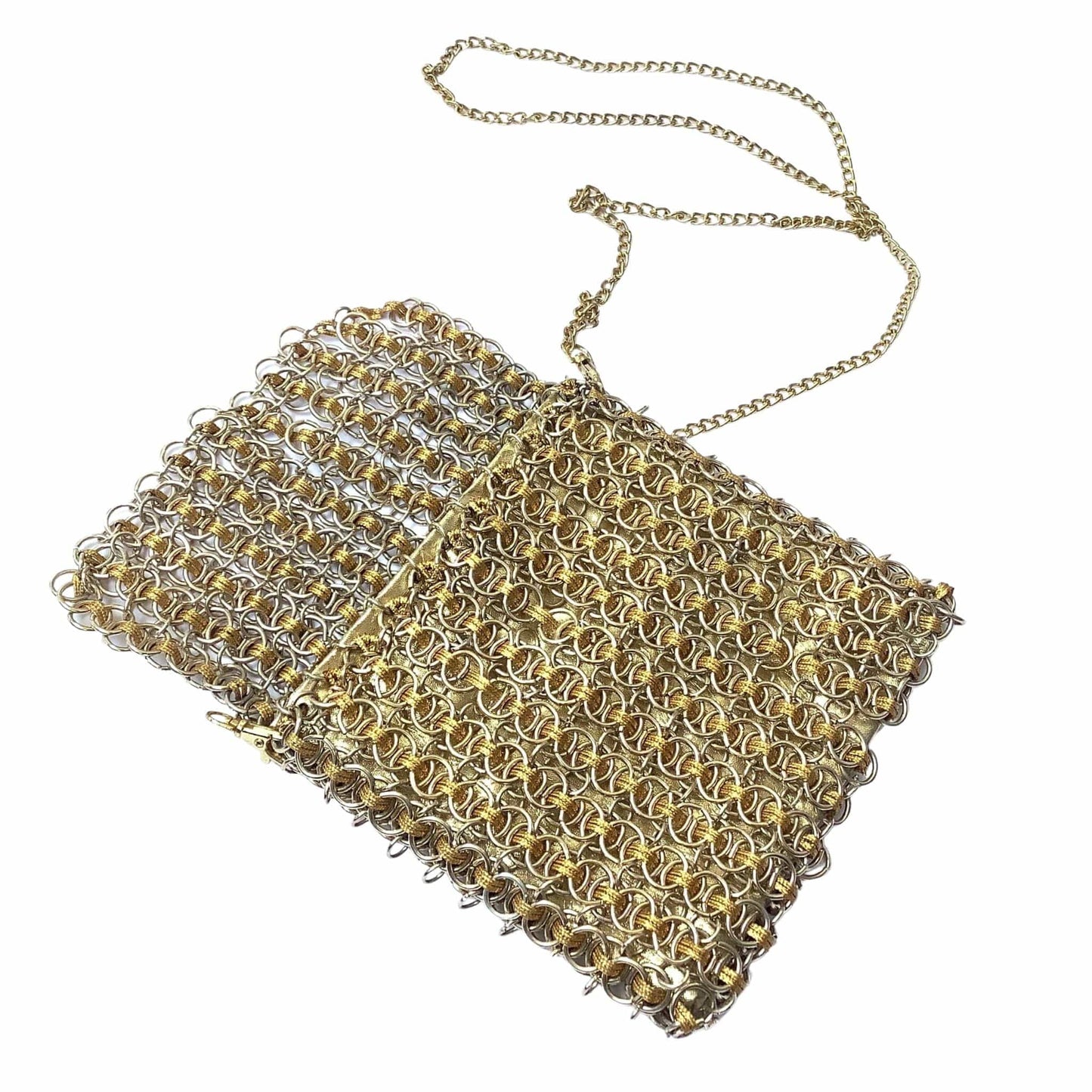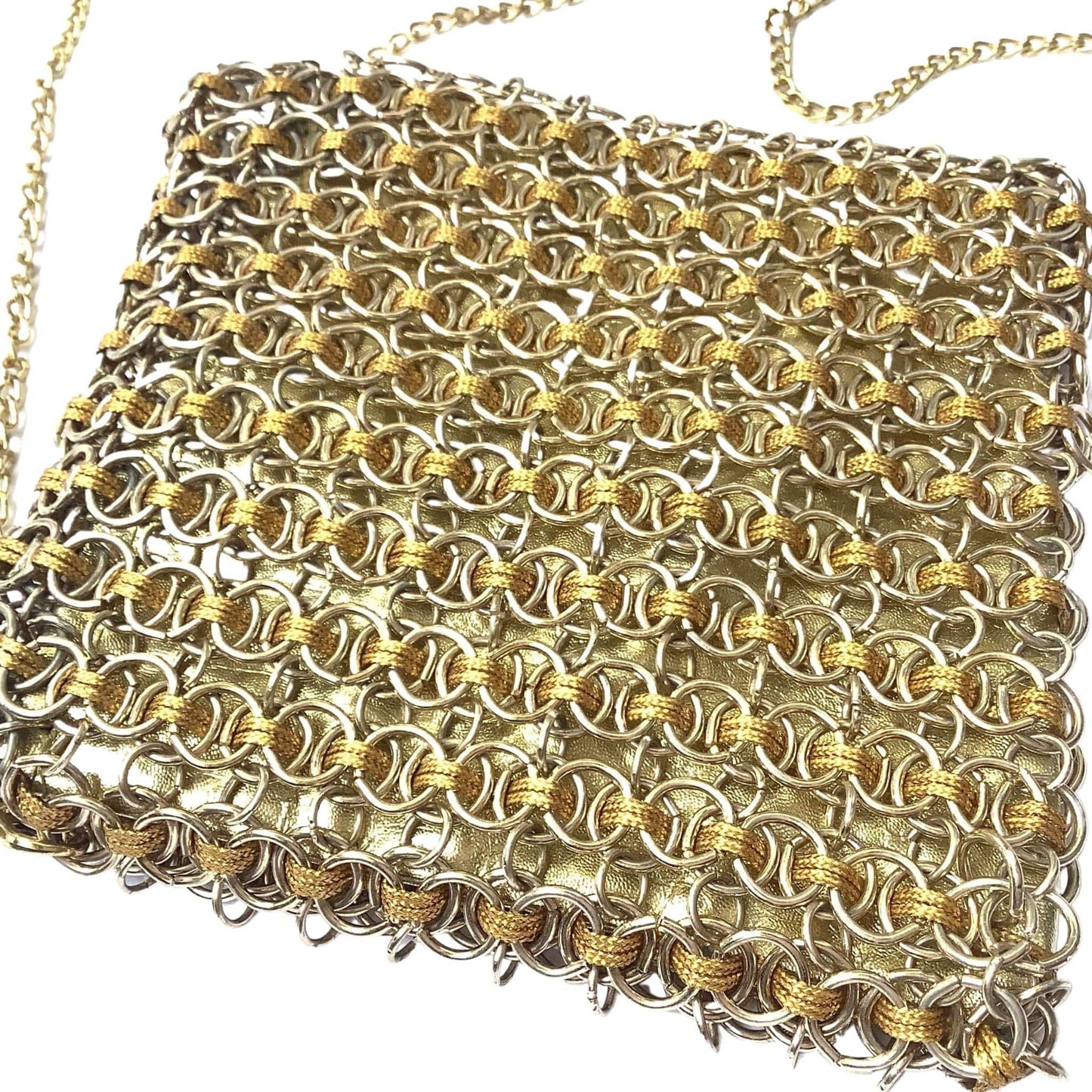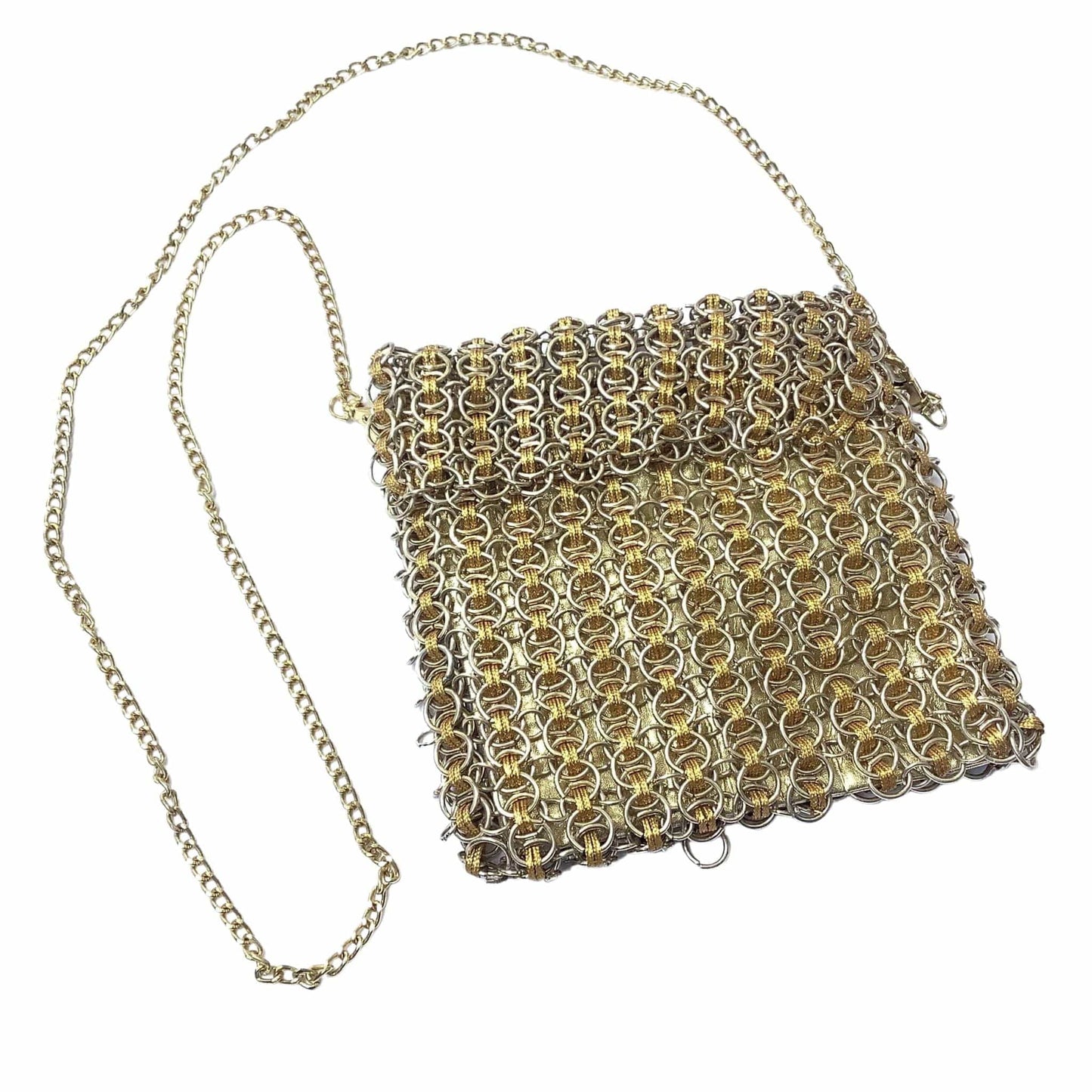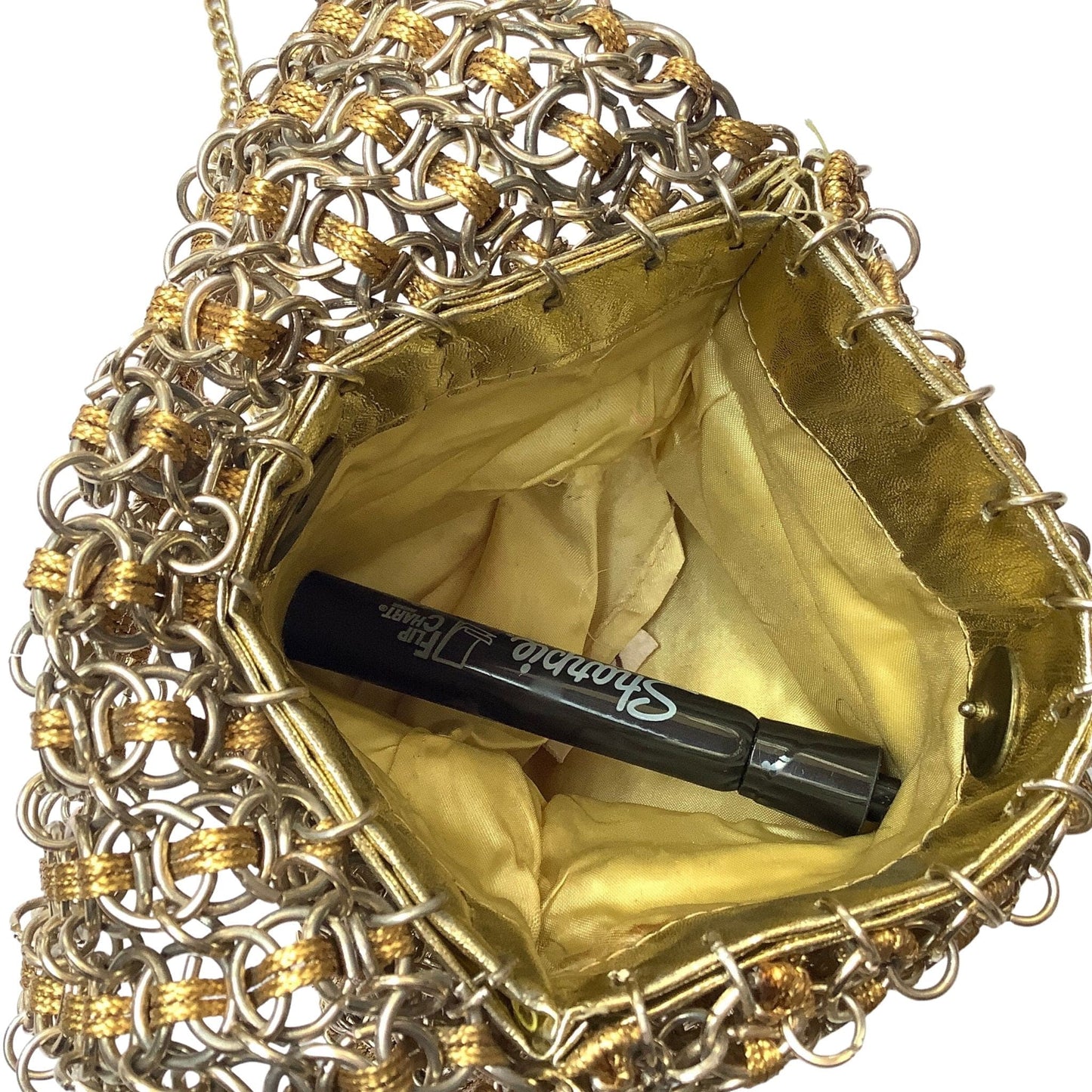 Revolutionary chain-link construction with interlocking gold-tone metal rings forming the exterior structure. Transparent vinyl inner bag secured within the metalwork framework allows contents to be partially visible through the rings. Compact crossbody design with integrated chain strap typical of 1960s mod fashion. Innovative construction method that eliminated traditional fabric exteriors in favor of architectural metal framework.