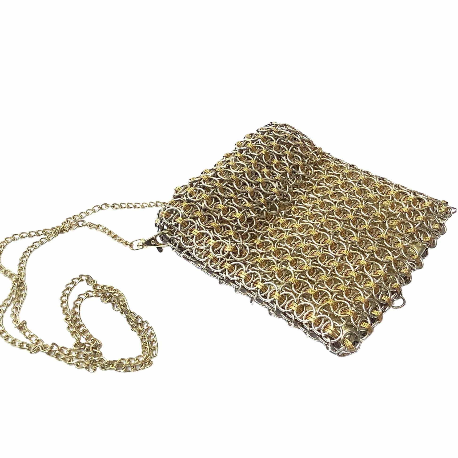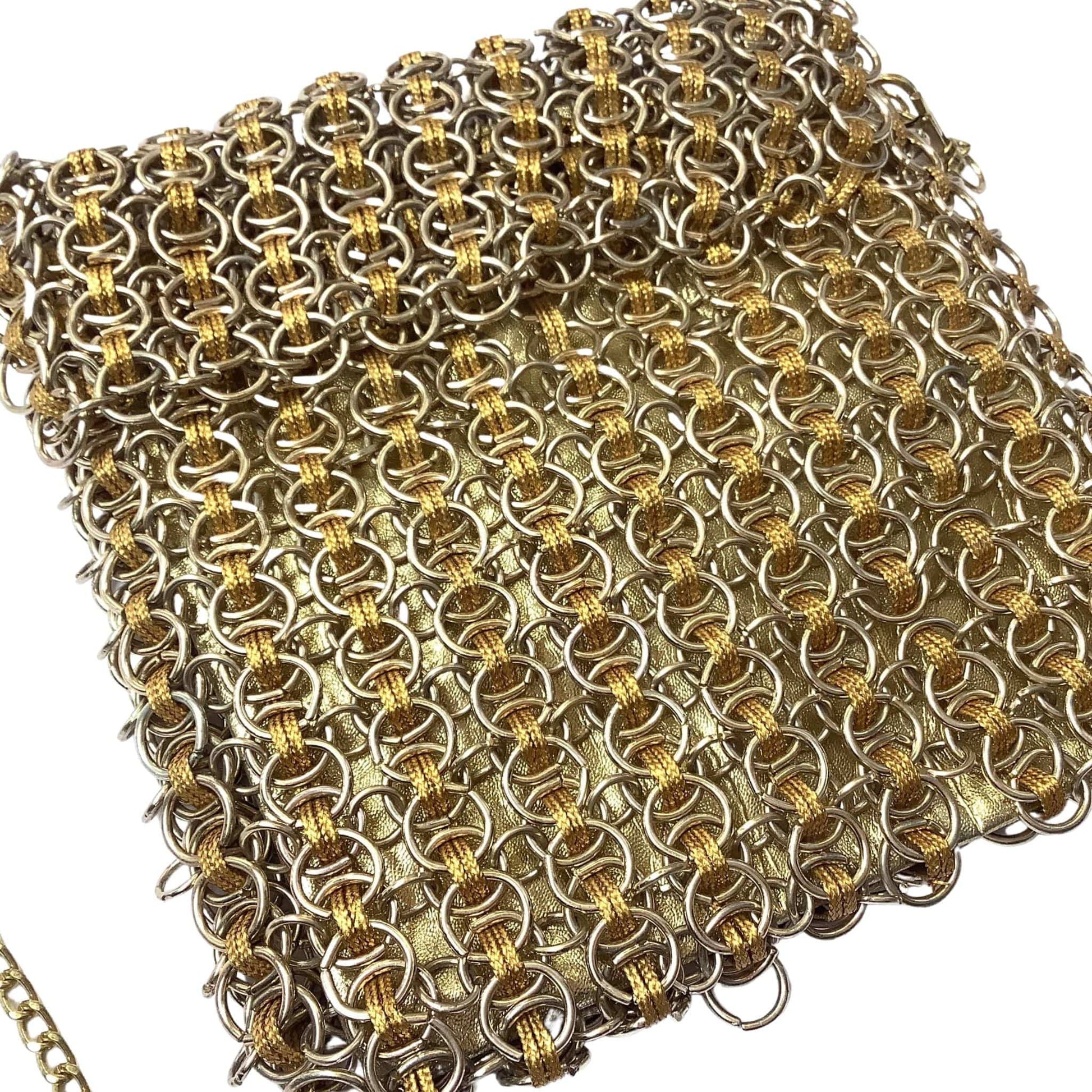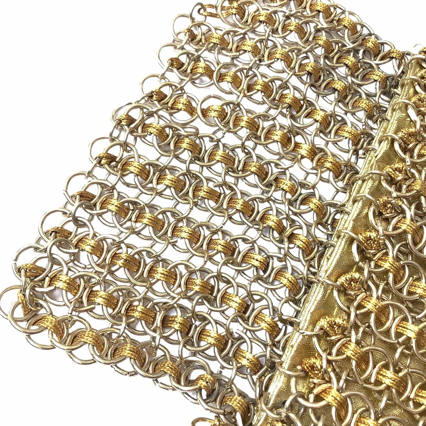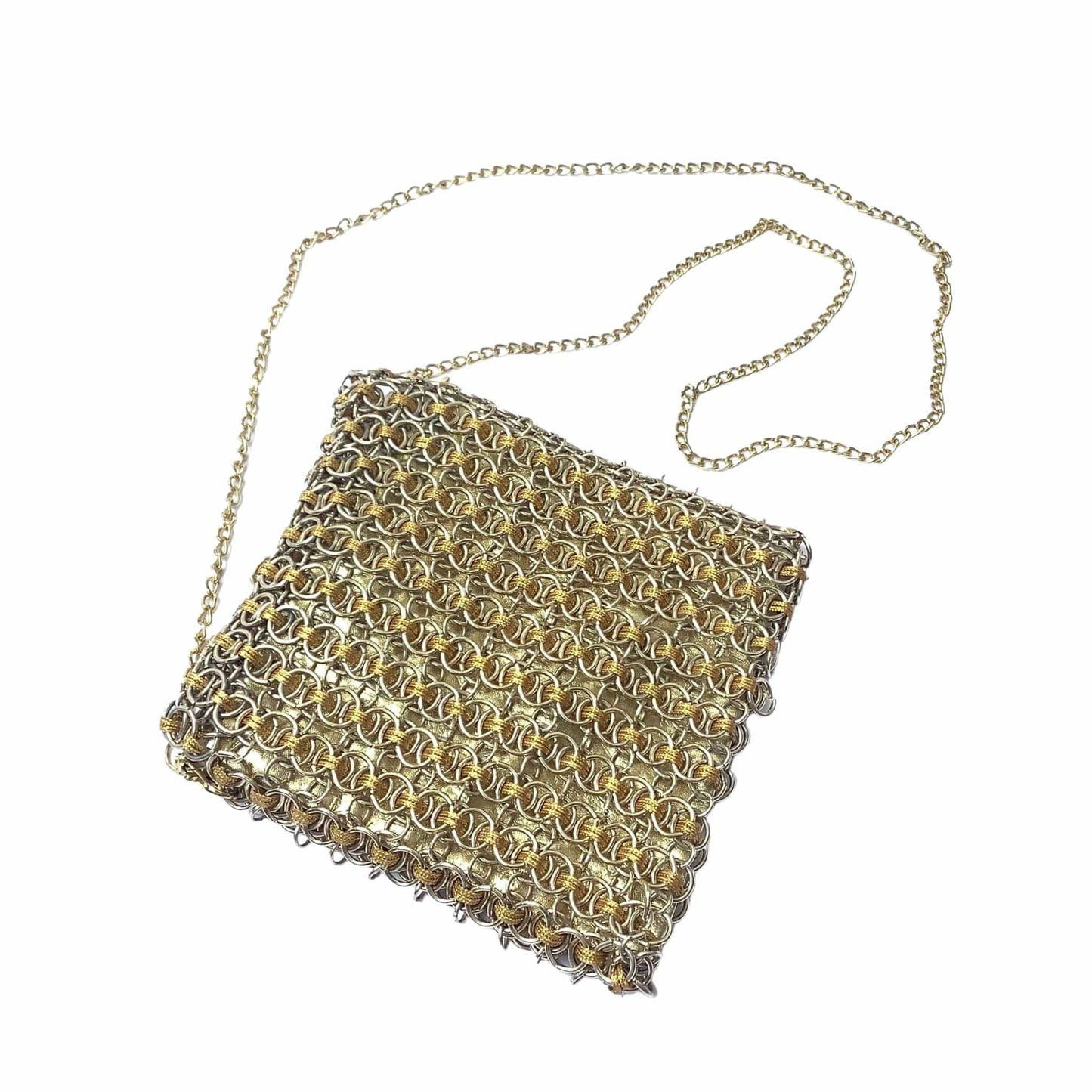 Revolutionary chain-link construction with interlocking gold-tone metal rings forming the exterior structure. Transparent vinyl inner bag secured within the metalwork framework allows contents to be partially visible through the rings. Compact crossbody design with integrated chain strap typical of 1960s mod fashion. Innovative construction method that eliminated traditional fabric exteriors in favor of architectural metal framework.