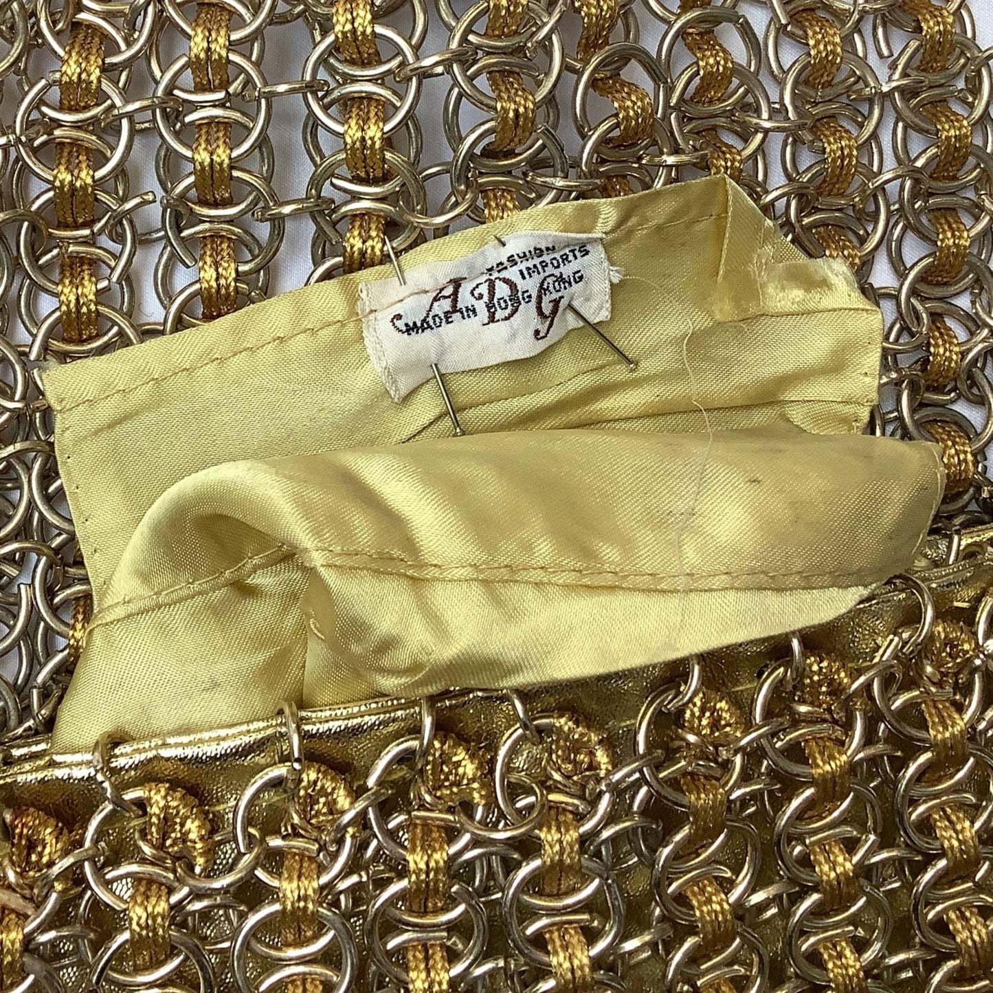 Pre-owned condition with expected vintage wear consistent with a 60-year-old collectible accessory. Interior vinyl pocket shows a tear extending halfway across, visible in product photos. Gold-tone metal rings maintain structural integrity with typical patina and minor surface wear from handling and storage. Chain-link construction remains secure and functional despite age-related characteristics.