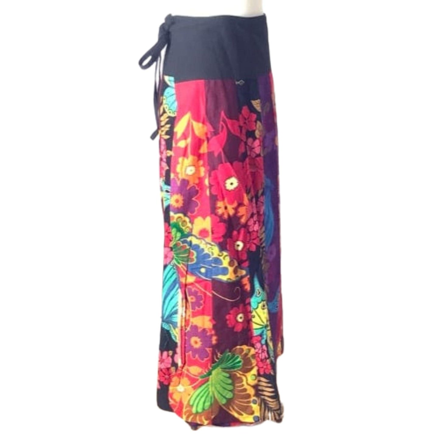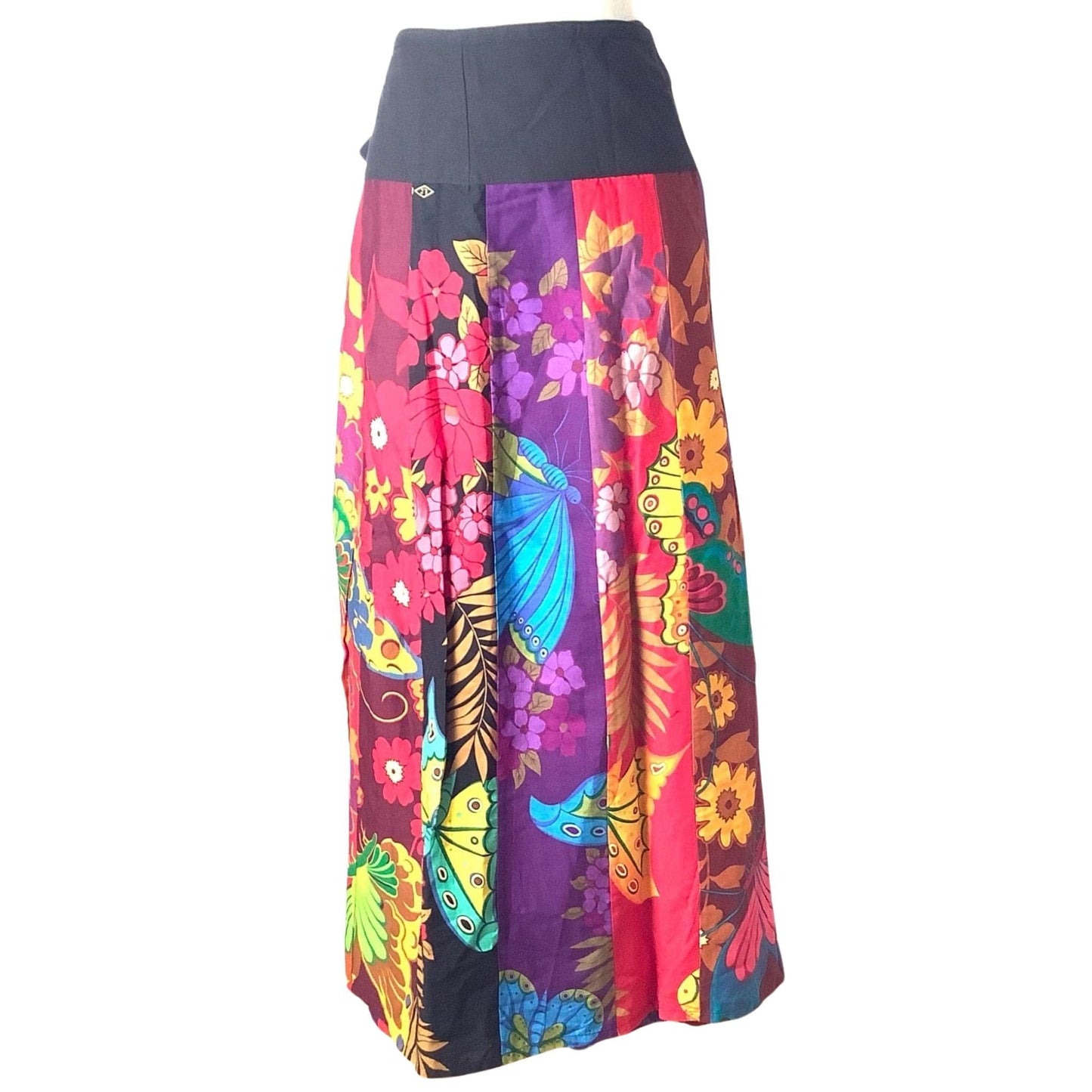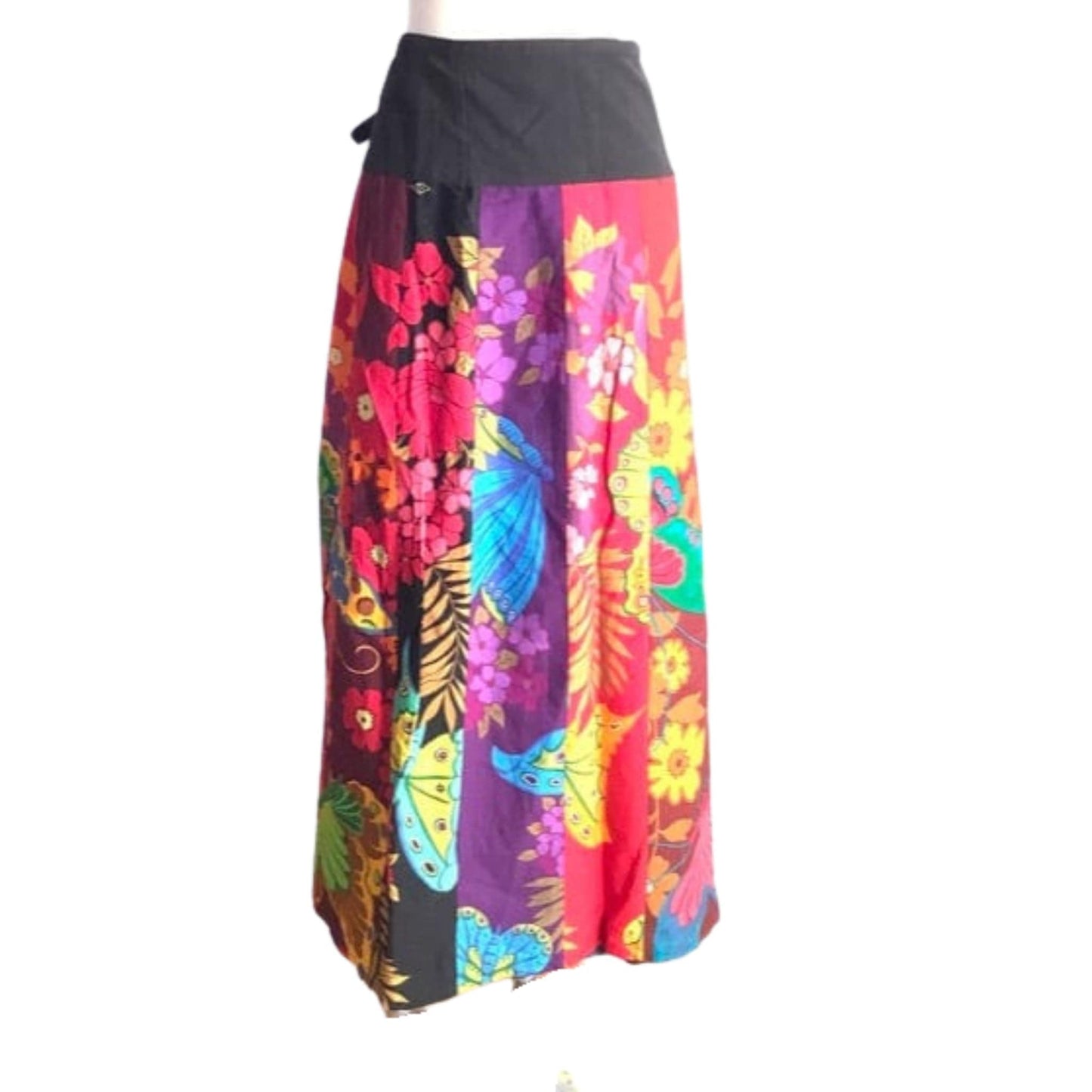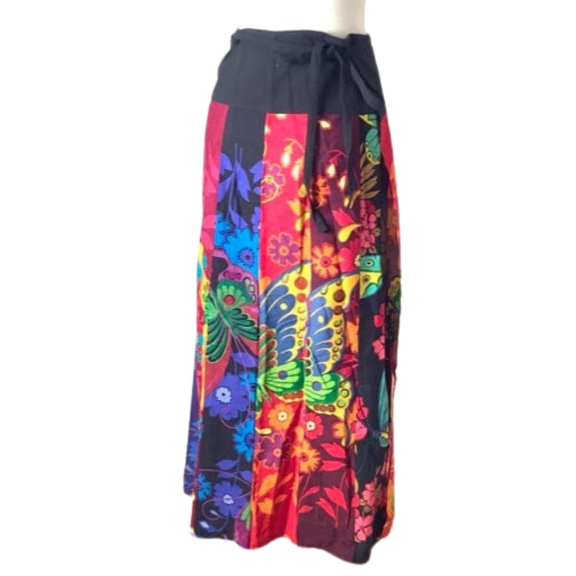 Handmade Maxi Wrap Skirt featuring vibrant tropical butterfly and floral print in a stunning multicolor palette. This authentic handmade piece showcases dramatic maxi-length silhouette with wrap-style construction and oversized black fabric waistband. Crafted from lightweight cotton fabric with bold Hawaiian-inspired botanical and butterfly motifs, this collectible piece represents genuine American-made craftsmanship. The easy tie closure at waist creates adjustable, versatile fit perfect for various body types and styling preferences.