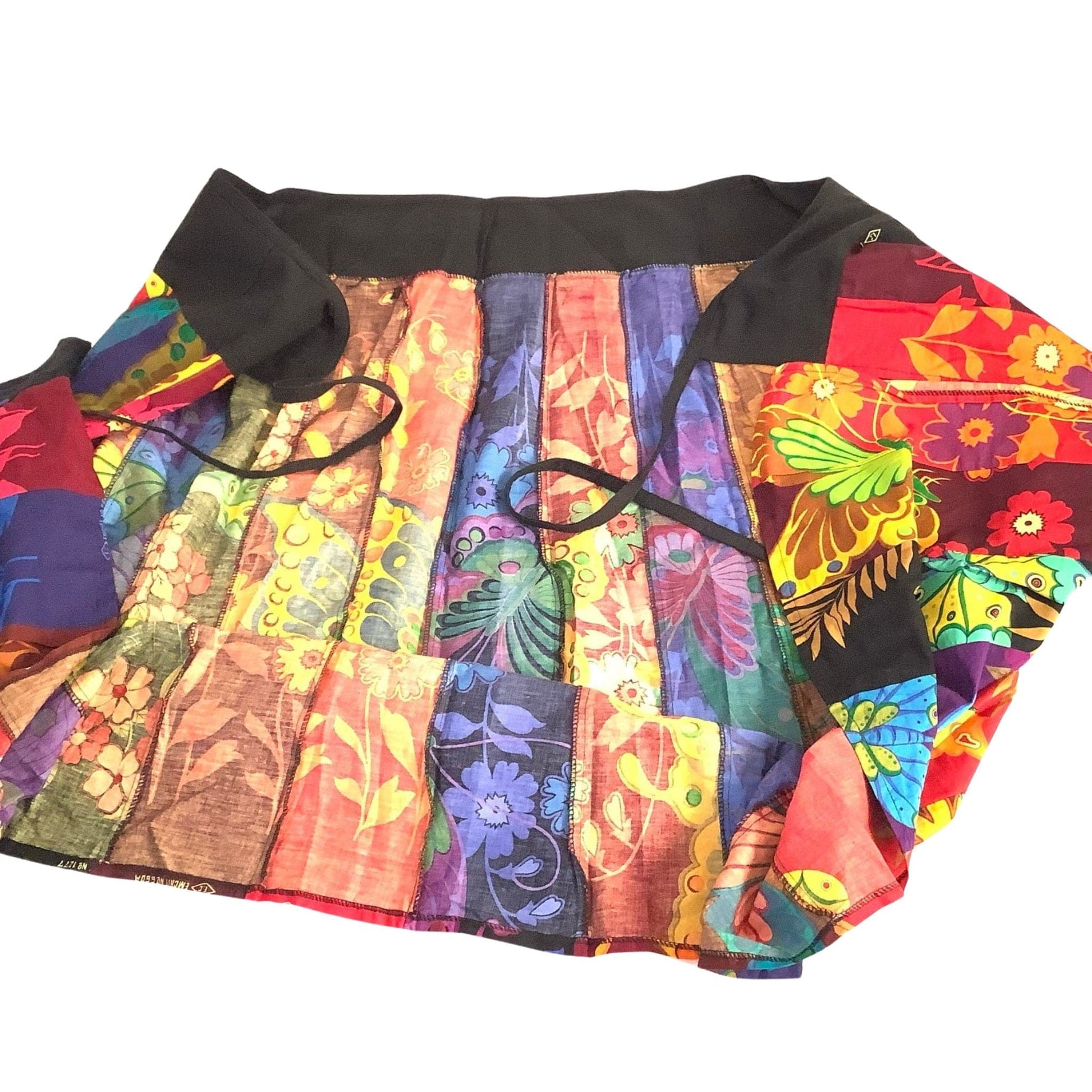 Handmade construction with authentic craftsmanship. Vibrant tropical butterfly and floral print creates bohemian appeal. Maxi-length wrap silhouette offers versatile, adjustable styling. Oversized black fabric waistband provides comfortable, secure fit. Easy tie closure allows customizable fit for various sizes. Lightweight cotton fabric perfect for warm weather and travel. Made in the USA collectible piece with authentic provenance.